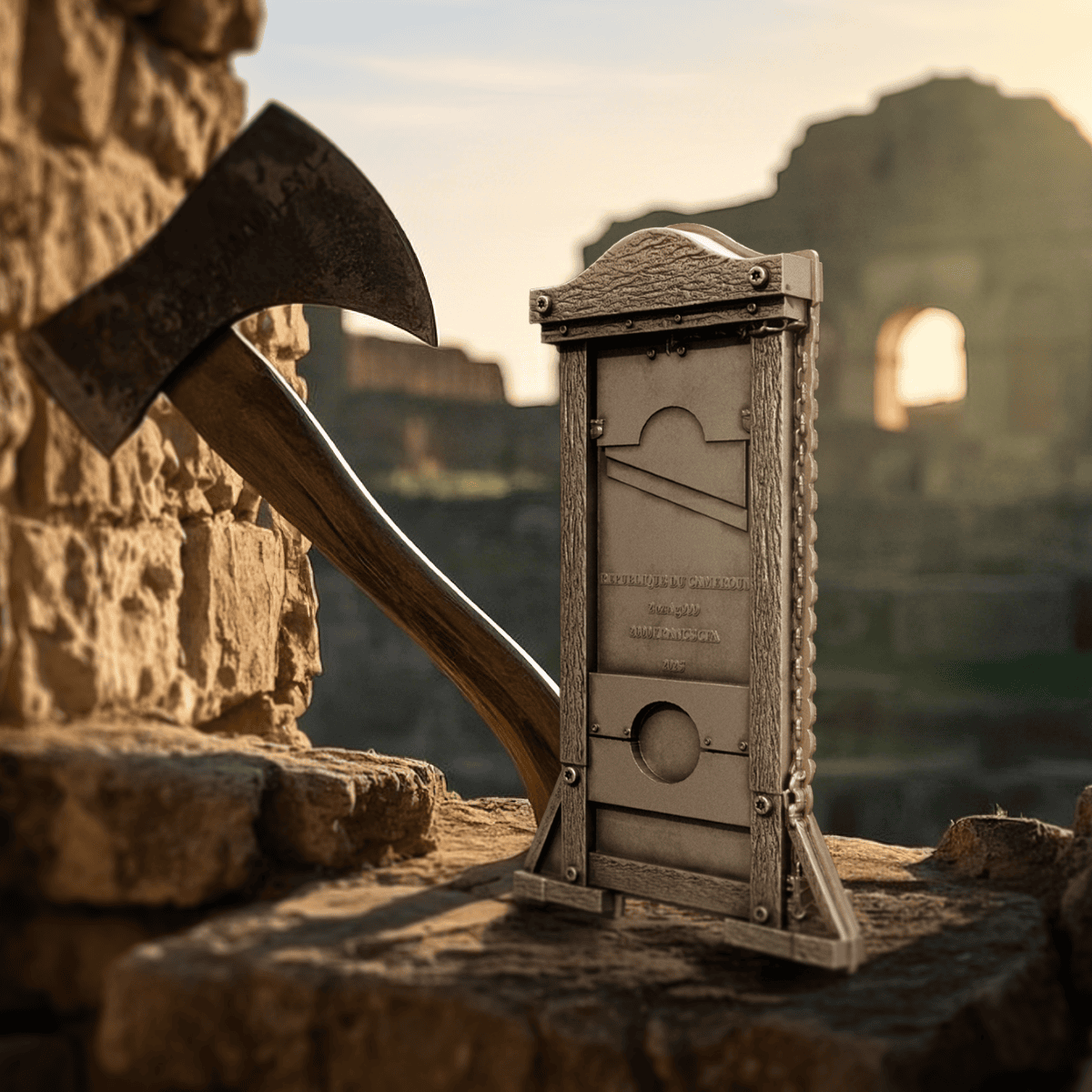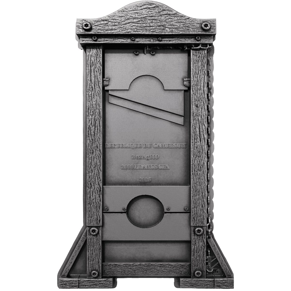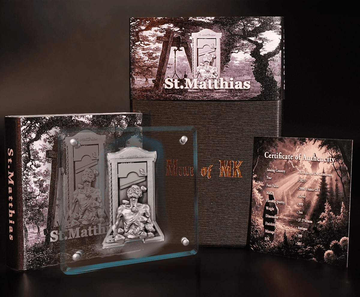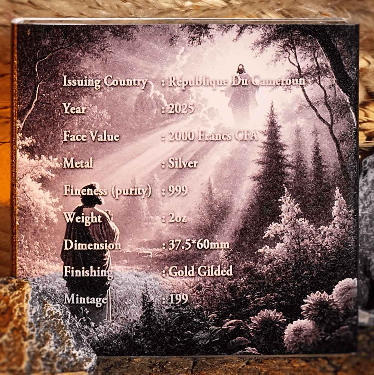 Meanwhile, the obverse introduces a guillotine-like frame, symbolizing martyrdom and the sanctified fate of early apostles. Crafted with wood-textured motifs and structural bolts, the frame surrounds the essential inscriptions: “RÉPUBLIQUE DU CAMEROUN”, “2oz Ag999”, “2000 FRANCS CFA”, and “2025”. Together, these elements confirm the coin’s weight, purity, and legal tender status. The antique finish deepens the visual impact, reinforcing the solemnity of sacrifice and the strength of conviction.