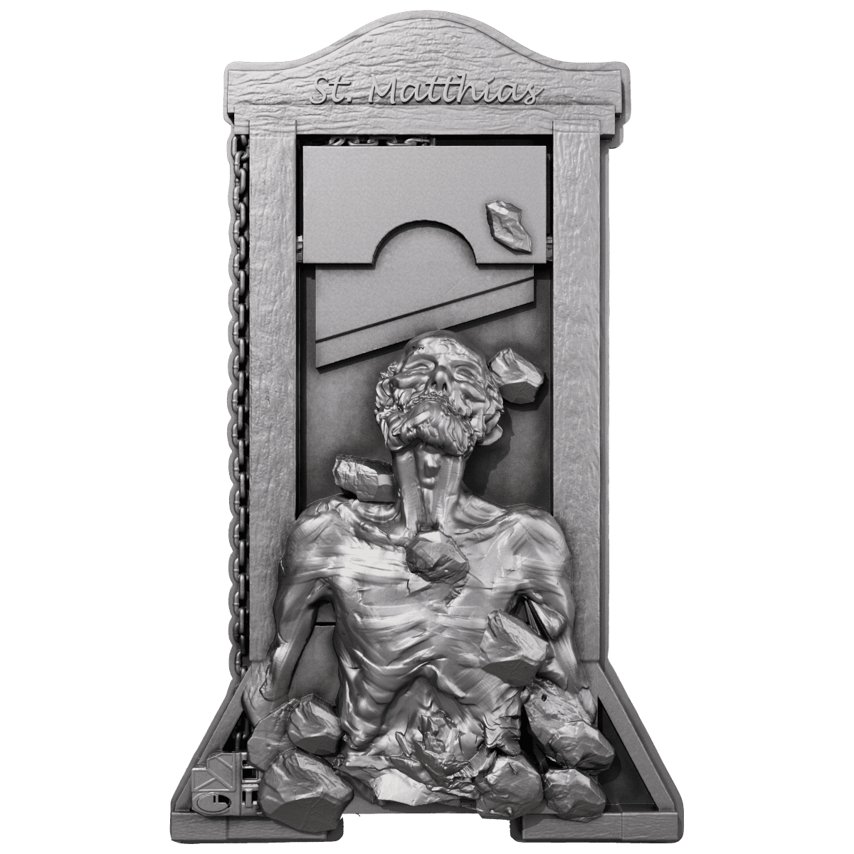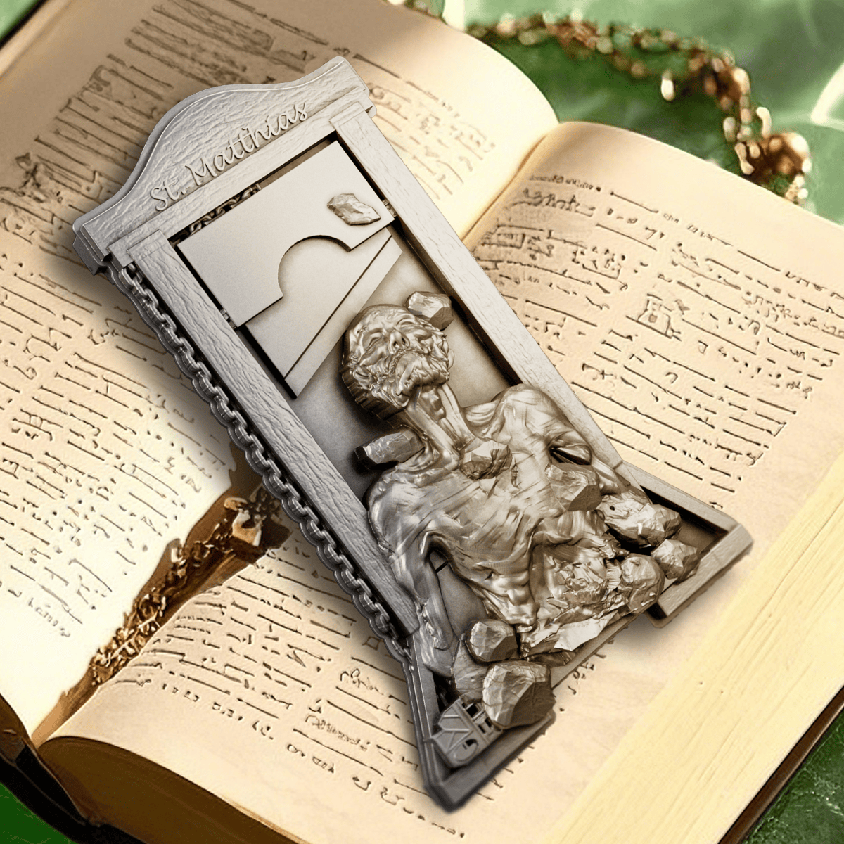 On the reverse, the coin depicts the powerful moment of St. Matthias’s martyrdom, historically believed to involve stoning and beheading. He emerges from a field of jagged stones, gazing upward with serenity and resolve. Each detail—from his weathered face to the scattering stones—reflects the gravity of his sacrifice. Above the scene, the inscription “St. Matthias” is delicately engraved, marking his eternal place among the Apostles. As a result, the design honors a man whose faith triumphed over death.