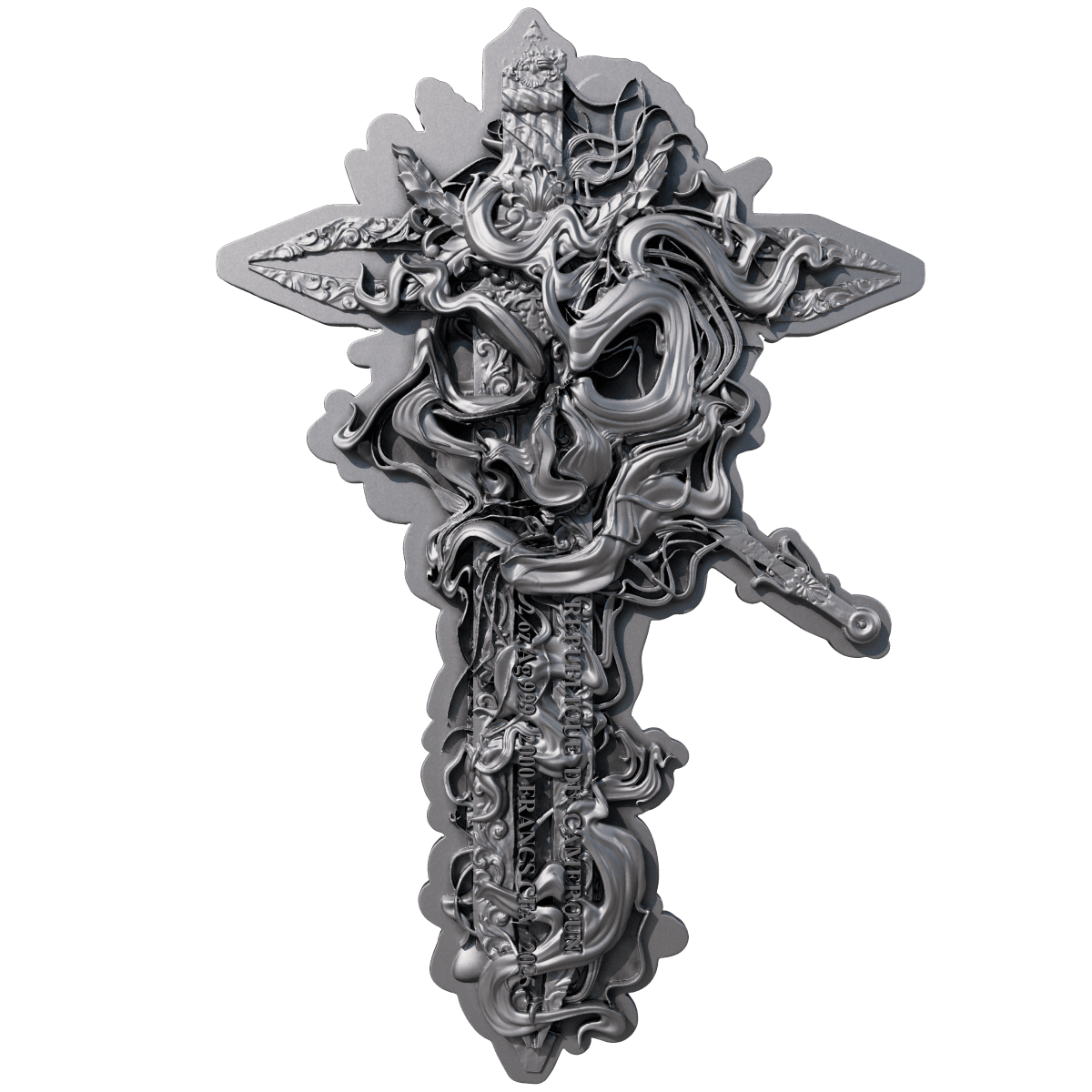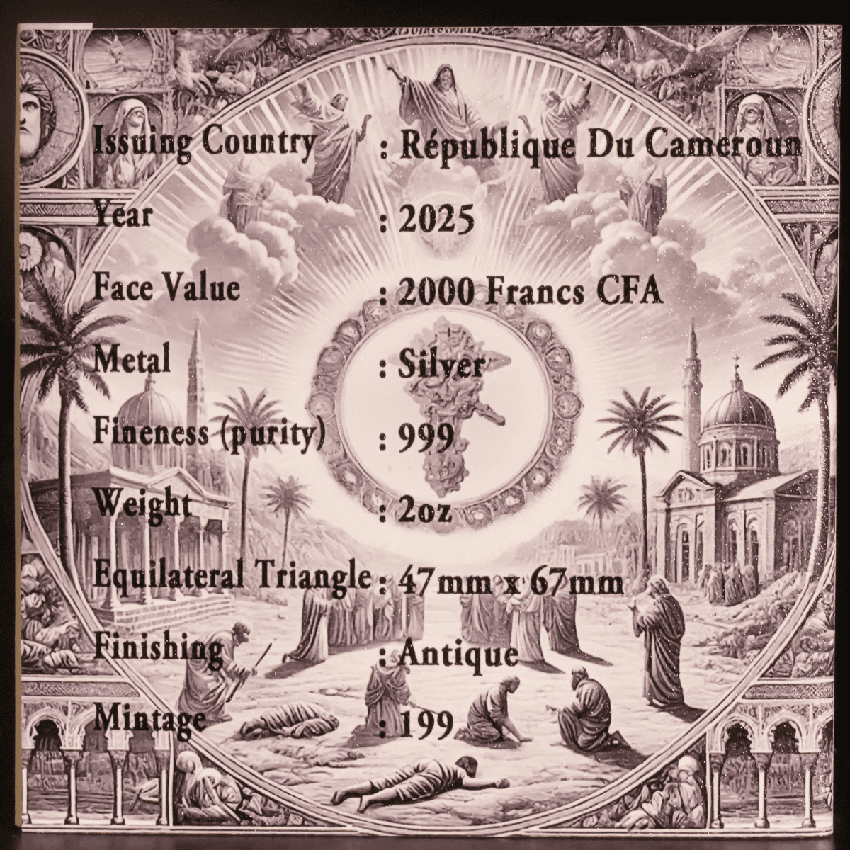Meanwhile, the obverse features the Cross of St. Thomas, a design woven with fluid and structured elements. This unique cross symbolizes the tension between skepticism and belief. In addition, the gilded finish adds brilliance, turning the cross into a beacon of spiritual clarity. Surrounding inscriptions include “RÉPUBLIQUE DU CAMEROUN 2000 FRANCS CFA”, “2025”, and “2oz Ag999”, confirming the coin’s weight, purity, and legal tender status.