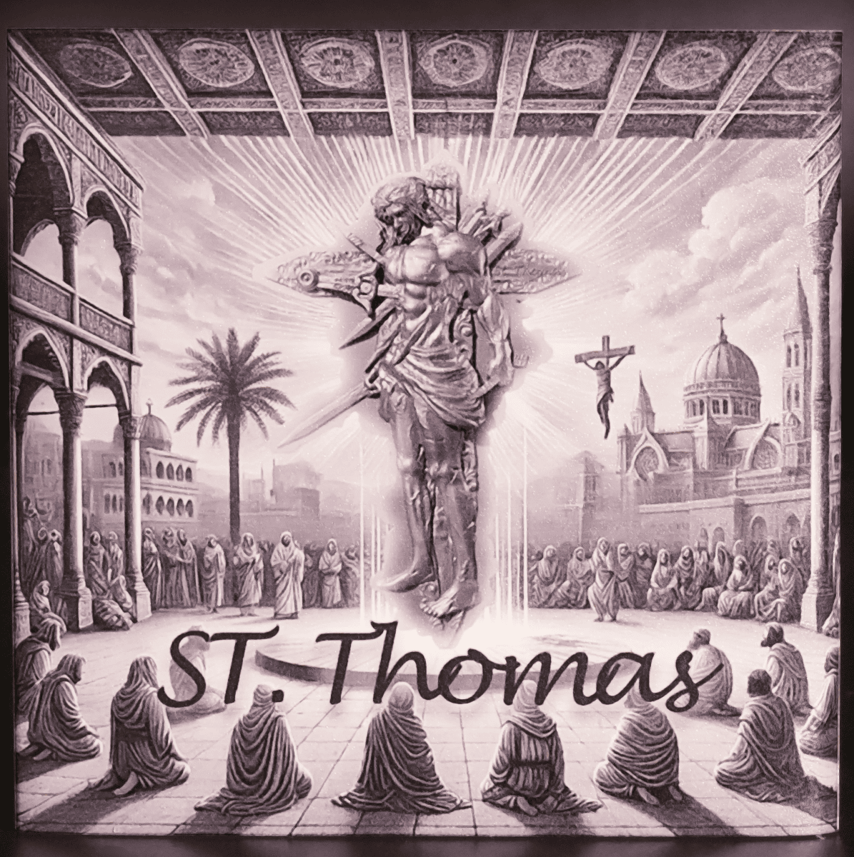 On the reverse, the coin captures the defining moment of St. Thomas’s transformation—his encounter with the risen Christ. Initially skeptical, Thomas reaches toward Christ’s wounds, his face filled with awe and conviction. As a result, this scene reflects the shift from doubt to unwavering belief. Selective gilding enhances the folds of garments and emotional contours. Furthermore, the composition is framed by intricate embellishments and engraved with the inscription “St. Thomas”, honoring the apostle who once demanded proof and later declared, “My Lord and my God.”