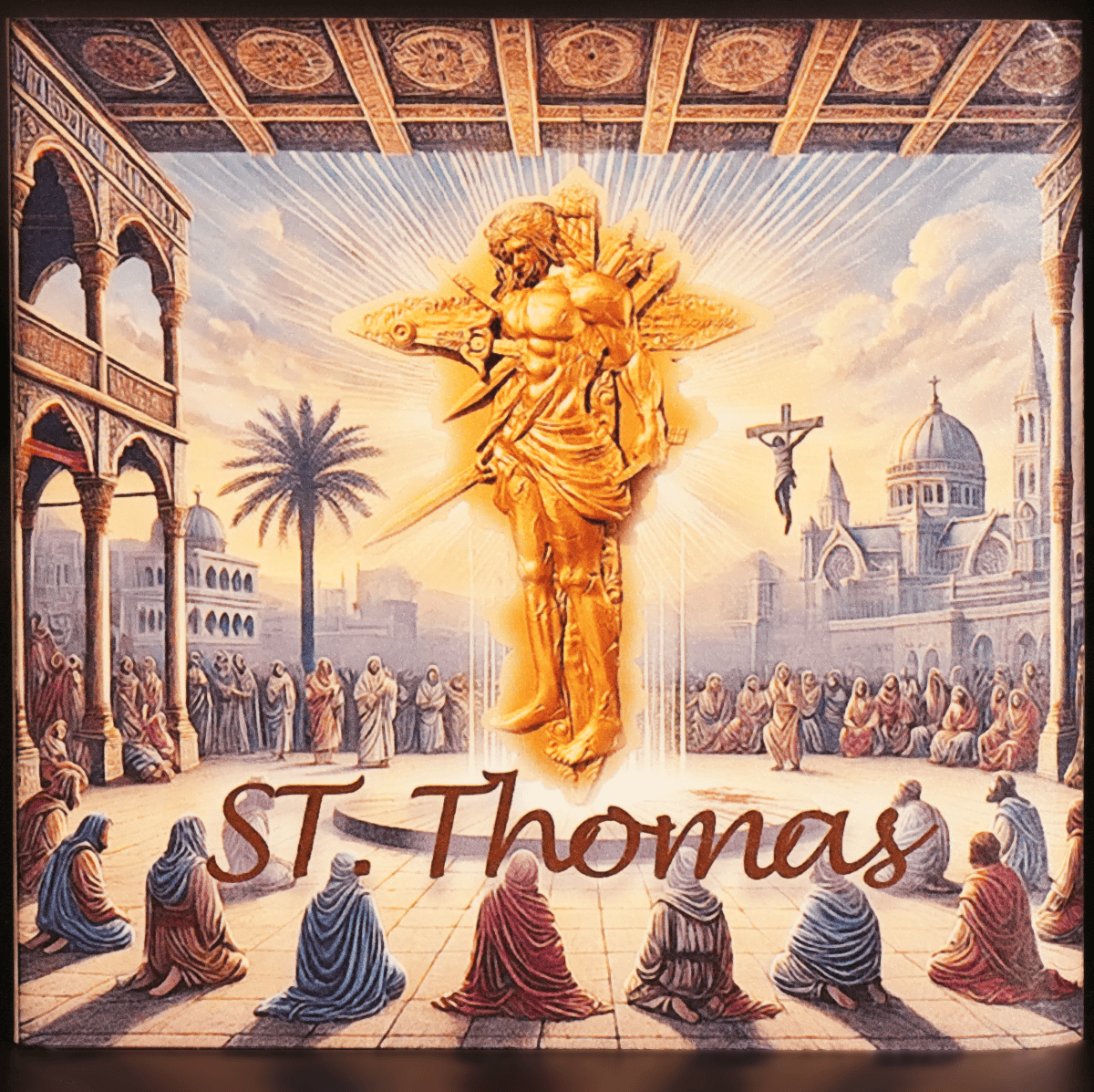 The reverse captures the moment when St. Thomas touched the wounds of the risen Christ. His astonished expression reflects the instant his doubt turned into faith. Selective gilding highlights the folds of garments and emotional contours. The scene is framed by intricate embellishments and engraved with the inscription “St. Thomas.” This design honors the apostle who once demanded proof and later declared, “My Lord and my God.”