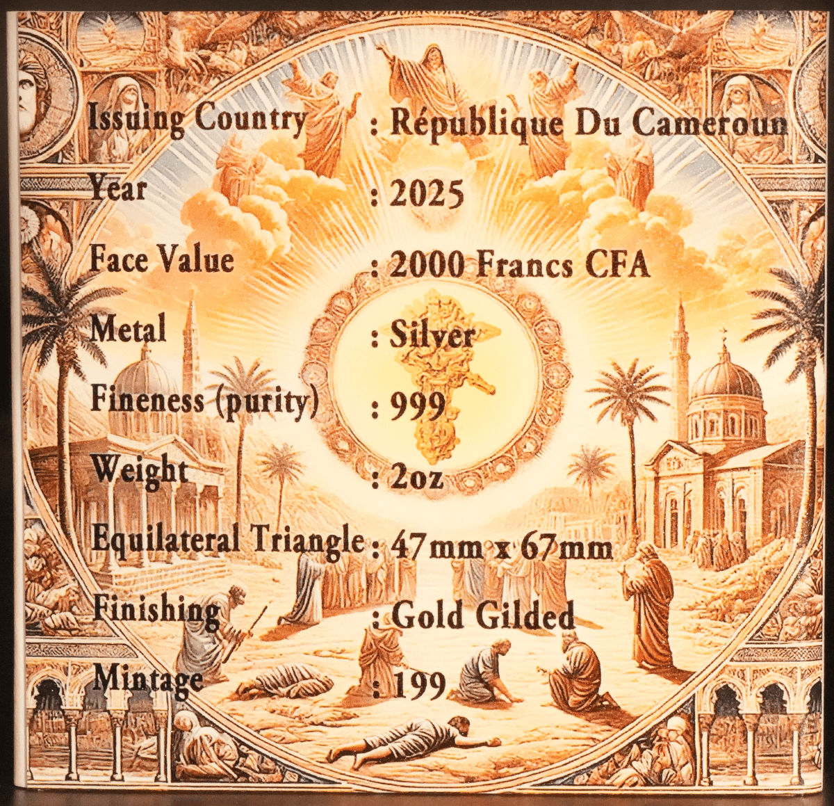 The obverse features the Cross of St. Thomas, a design woven with fluid and structured elements. It symbolizes the tension between skepticism and belief. The gilded finish adds brilliance, turning the cross into a beacon of spiritual clarity. Surrounding inscriptions include “RÉPUBLIQUE DU CAMEROUN 2000 FRANCS CFA”, “2025”, and “2oz Ag999”, confirming the coin’s weight, purity, and legal tender status.