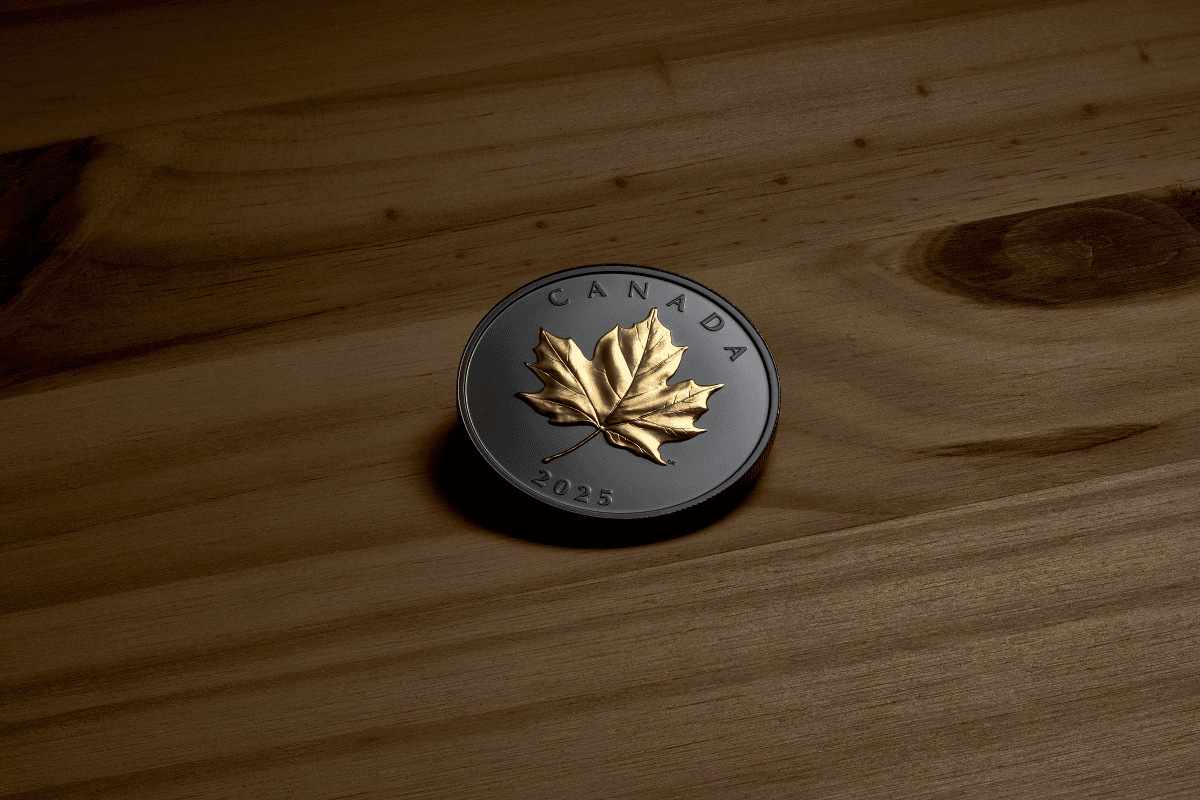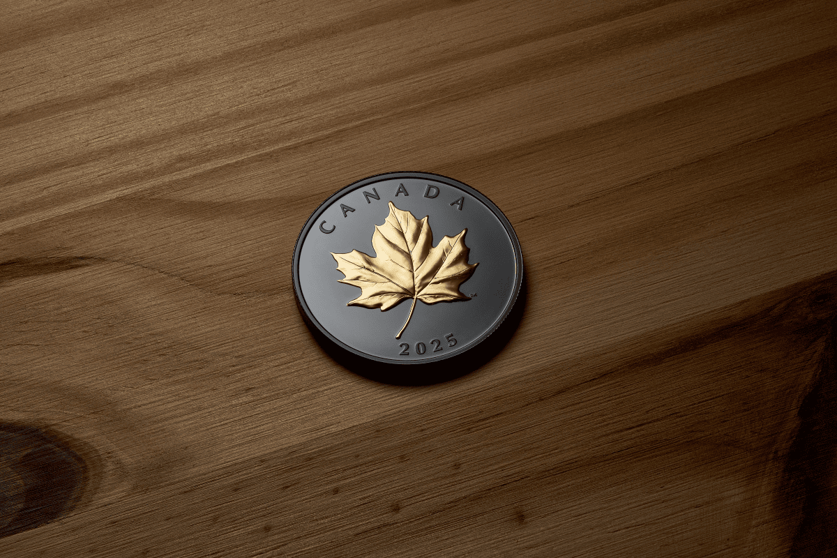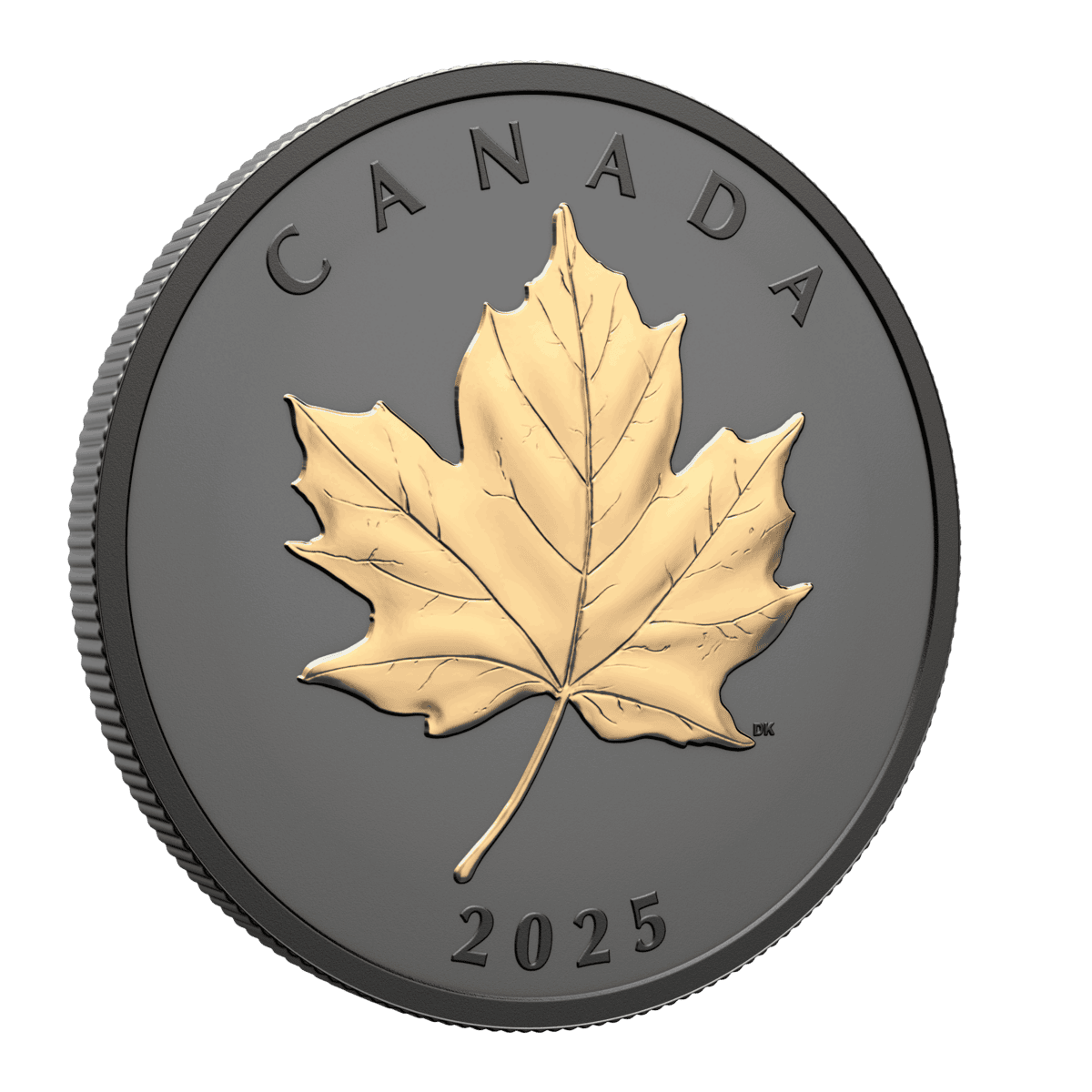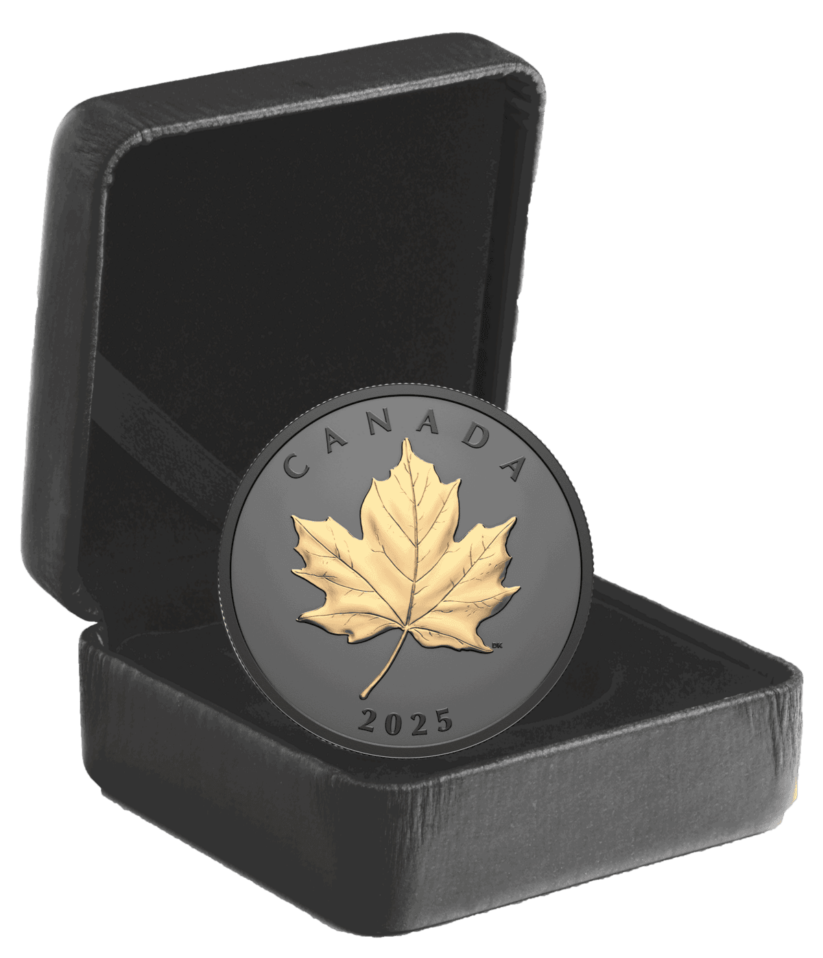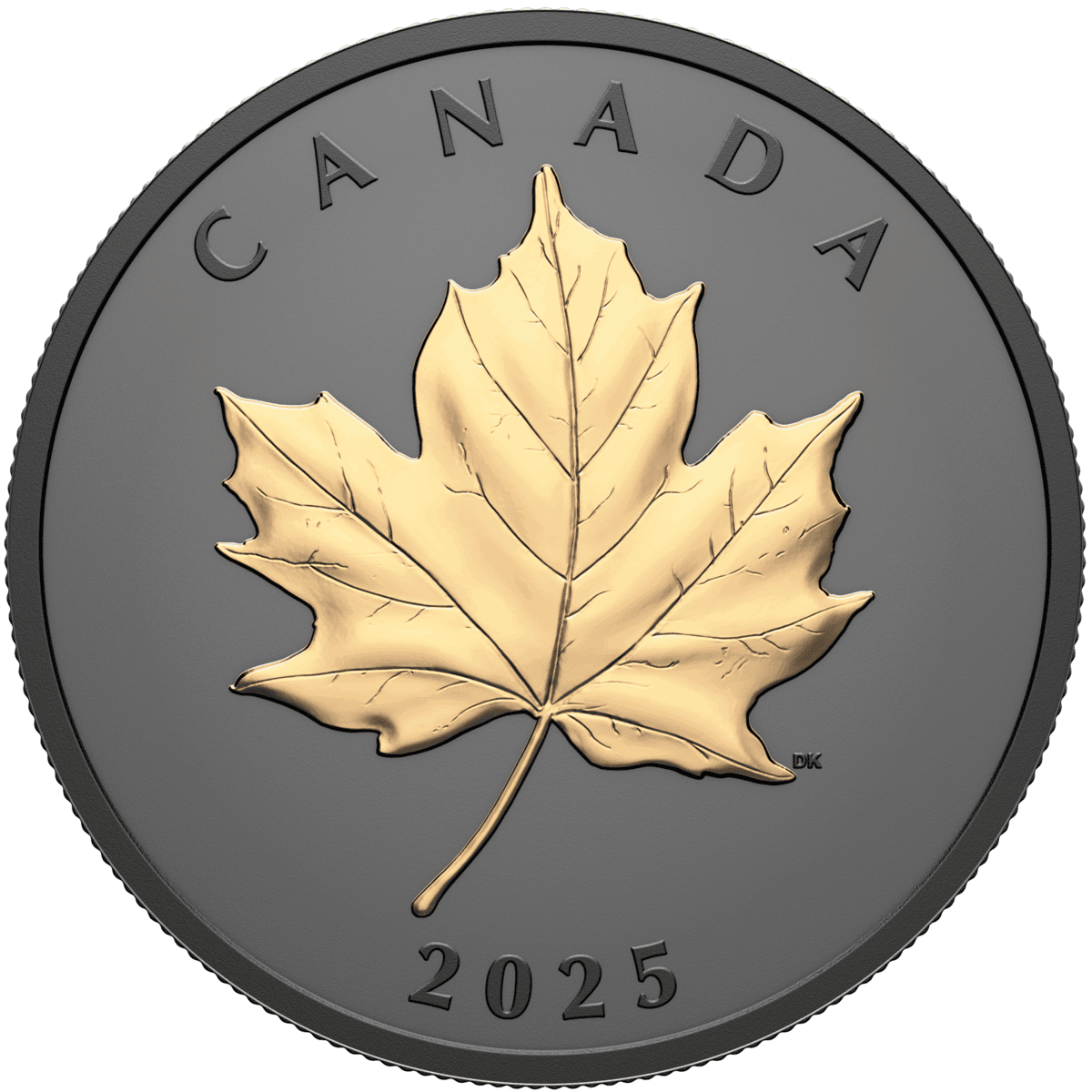 The 2025 Canada Elegant Maple 1 oz Silver Gilded Matte Proof Rhodium Coin celebrates the timeless beauty of one of Canada’s most cherished emblems. The sugar maple, known for its distinctive lobes and deeply veined structure, stands as a national symbol of resilience and grace. On this release from the Royal Canadian Mint, the leaf takes center stage, enhanced with rich gold plating that glows against a field of black rhodium. The result is a bold contrast of light and dark, brilliance and matte, that elevates the maple leaf to a true work of numismatic art.