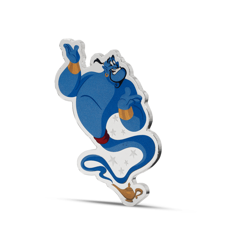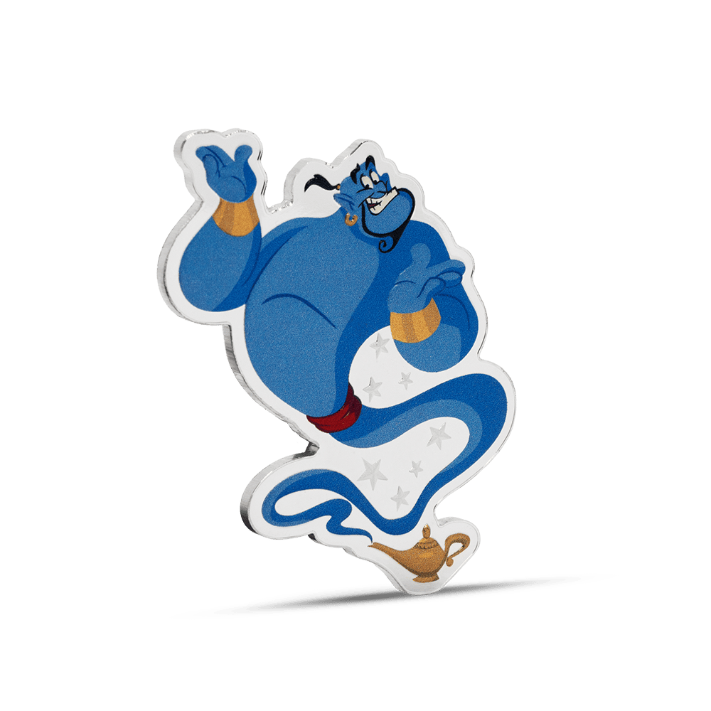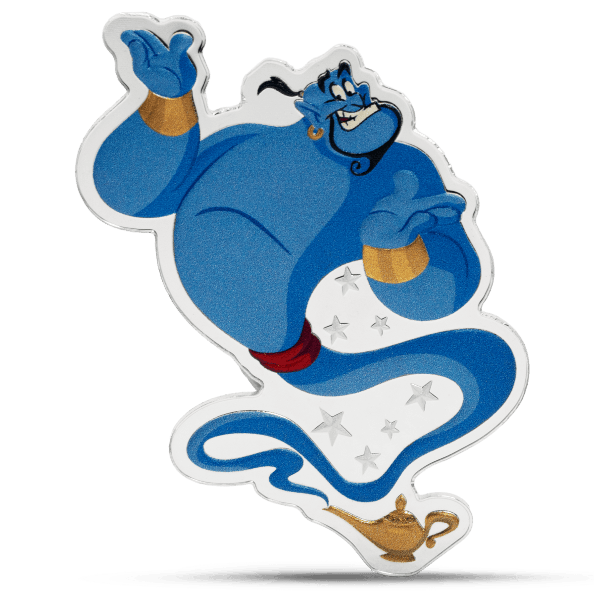Struck from 1 oz of .999 pure silver, this shaped and colorized coin features Genie in his classic animated form. The artwork captures his playful energy and magical charm in striking color and cartoon detail, enhanced by a proof-quality finish that adds brilliance and depth.