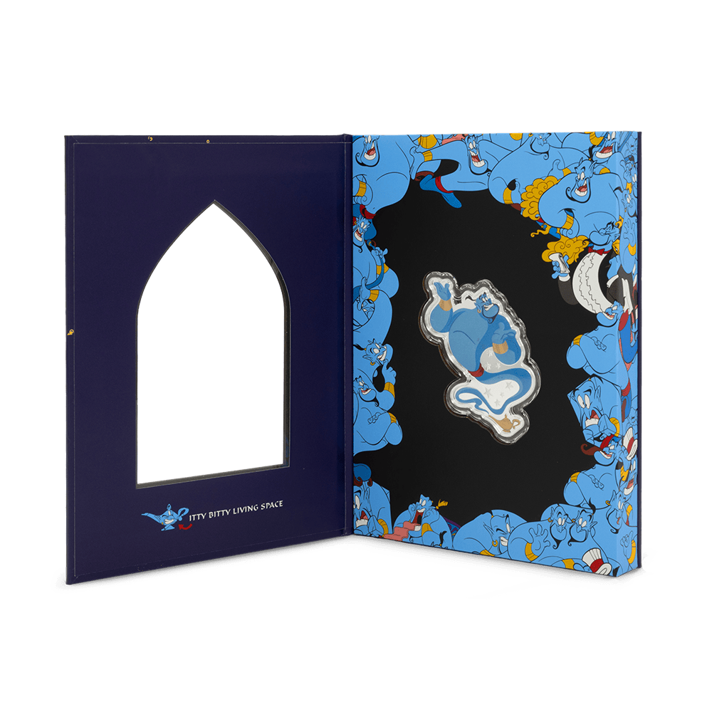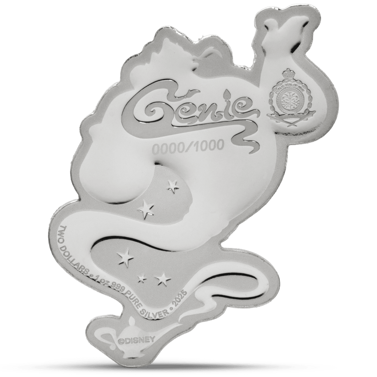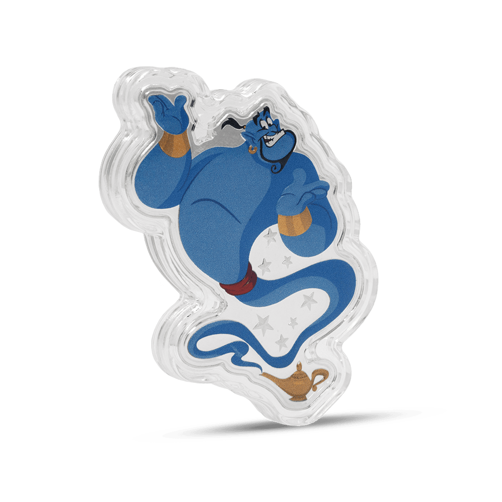 Struck from 1 oz of .999 pure silver, this shaped and colorized coin features Genie in his classic animated form. The artwork captures his playful energy and magical charm in striking color and cartoon detail, enhanced by a proof-quality finish that adds brilliance and depth.