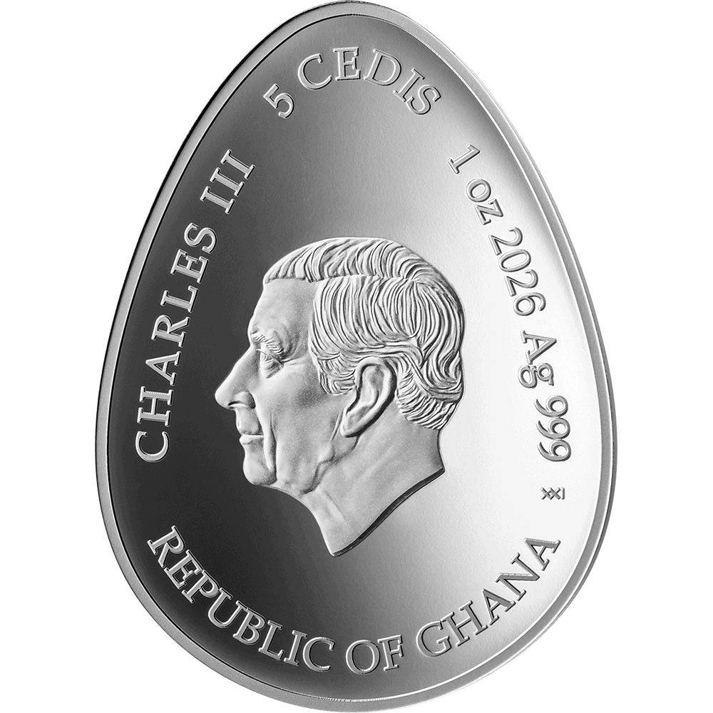 Struck from one troy ounce of .999 fine silver, the coin features a distinctive oval shape measuring 33 × 45 mm. Its proof finish enhances depth and clarity, allowing the design to shine with precision and color. Issued by the Republic of Ghana with a face value of 5 Cedis, it combines authenticity with elegant presentation.