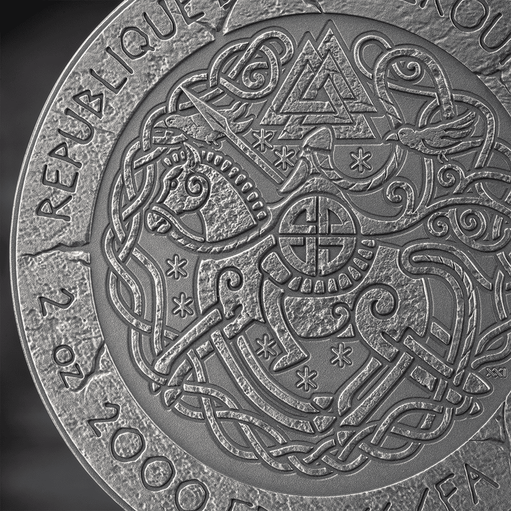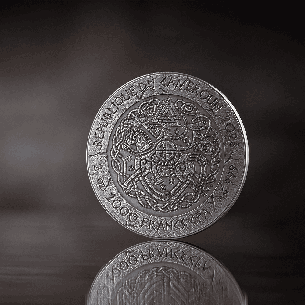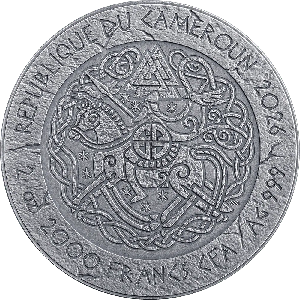 Struck from .999 fine silver, the coin measures 50 mm in diameter and carries a face value of 2000 Francs CFA. Each element — from the intricate background to the warrior’s expression — showcases masterful artistry and technical precision. The result is a coin that embodies courage, strategy, and the enduring spirit of Norse heritage.