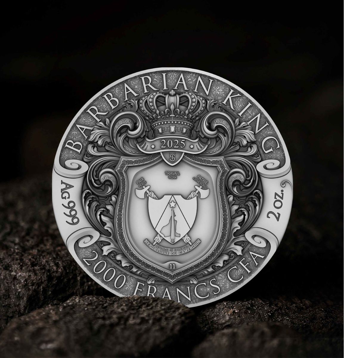 The 2025 Cameroon Barbarian King 2 oz Silver Antiqued Colorized Coin captures raw power and myth in precious metal. Struck from .999 fine silver, this release weighs 62.2 grams (2 ounces) and measures 45 mm. Finished in antiqued detail with selective color, it presents a story of conquest and sovereignty forged into enduring art.