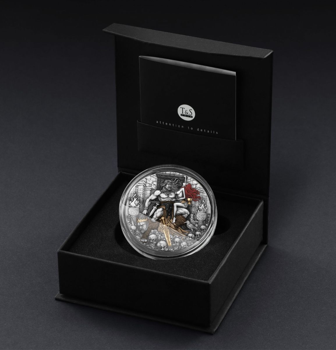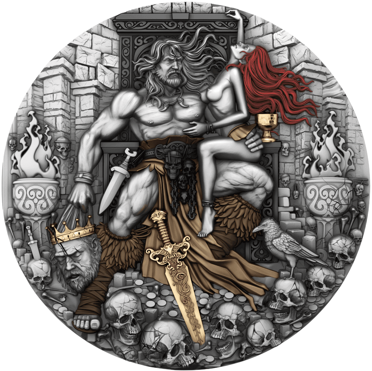 The design embodies conquest and endurance. The throne rises unshaken among the remnants of destruction, symbolizing power that survives chaos. The maiden reflects devotion and legacy, while the setting whispers of endless battles that forged the King’s dominion. As a result, the coin is both a tale of myth and a striking collectible.