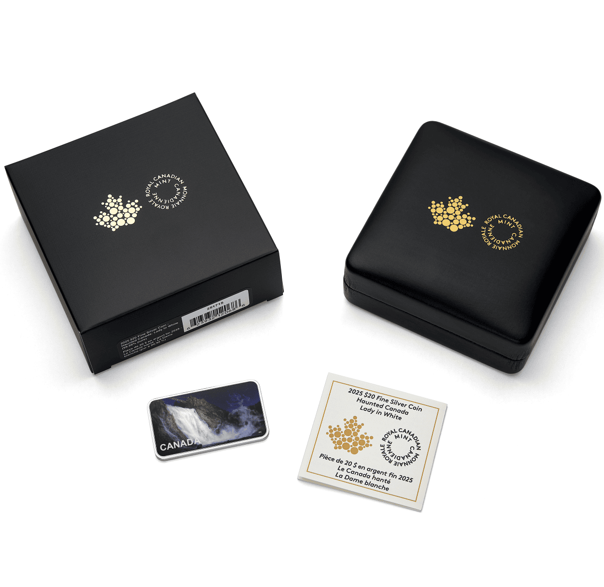 Each coin comes in a black clamshell case with a black beauty box, along with a Certificate of Authenticity. This elegant packaging ensures safe storage while making the coin gift-ready. More than a numismatic item, the Lady in White coin bridges Canadian history, folklore, and innovation. It invites collectors to hold not only silver but also a ghost story told through artistry and light.