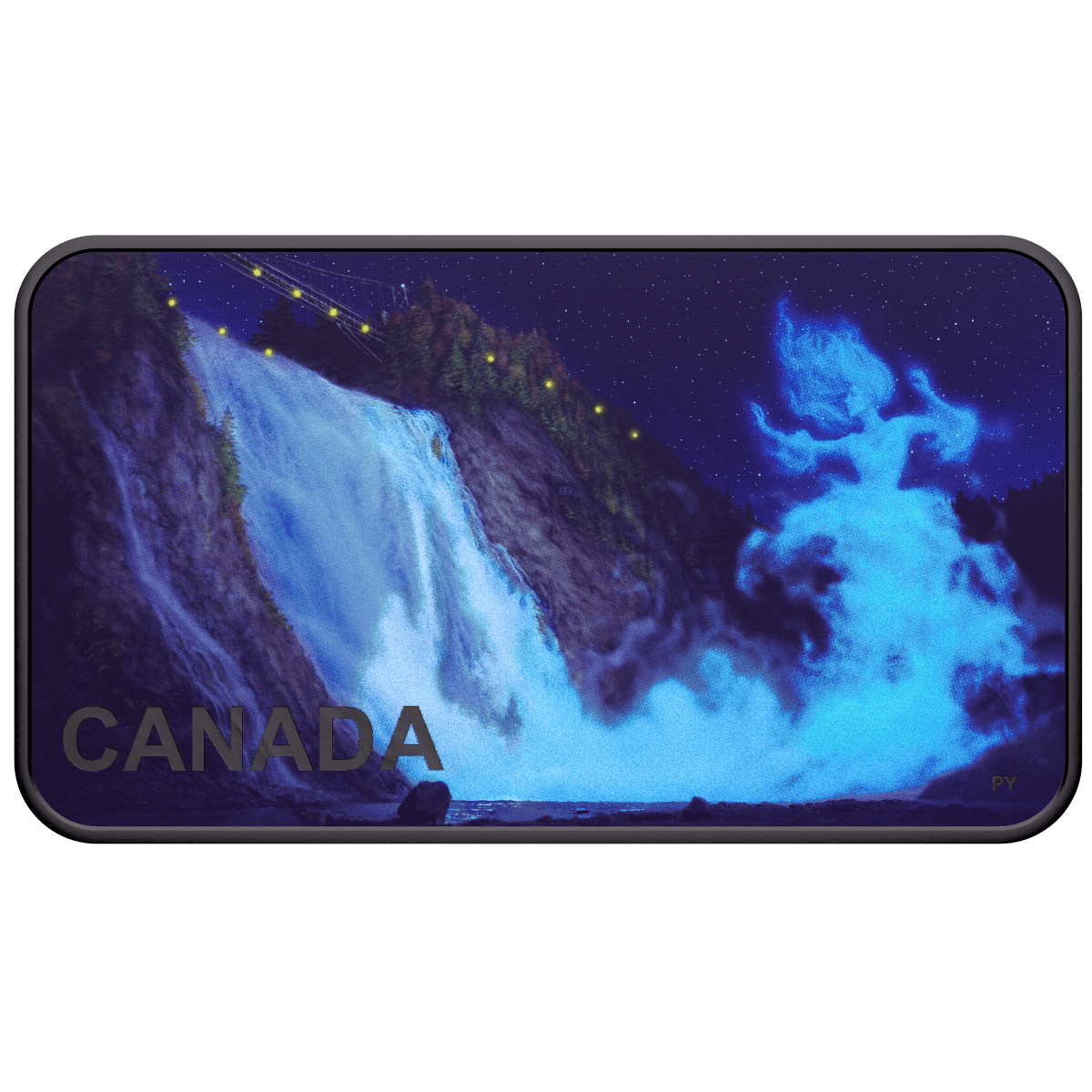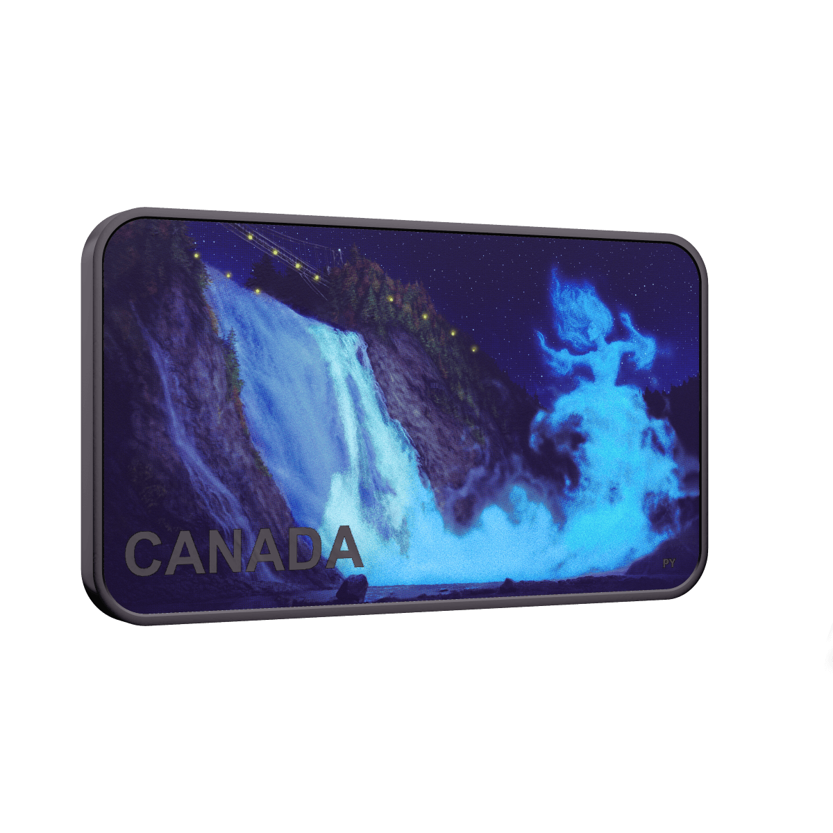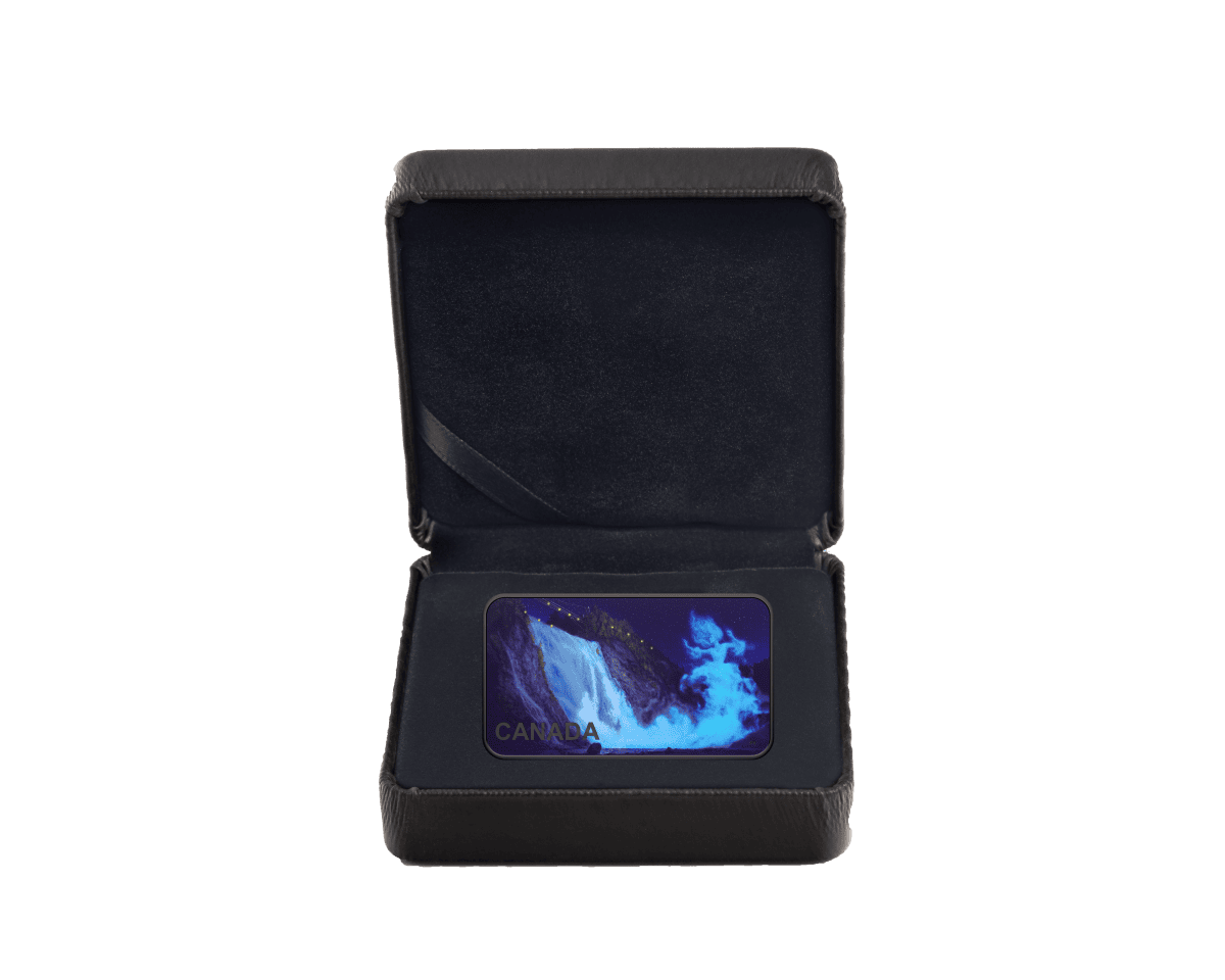 Crafted by the Royal Canadian Mint, this rectangular coin contains 1 oz (31.56 g) of 99.99% pure silver. It measures 49.8 mm by 28.6 mm, offering a wide, cinematic view of the misty falls. The proof finish highlights a colorful landscape, while advanced black light paint reveals the Lady in White’s ghostly figure when illuminated by the included flashlight. This interactive feature transforms the coin from a traditional collectible into a storytelling experience.