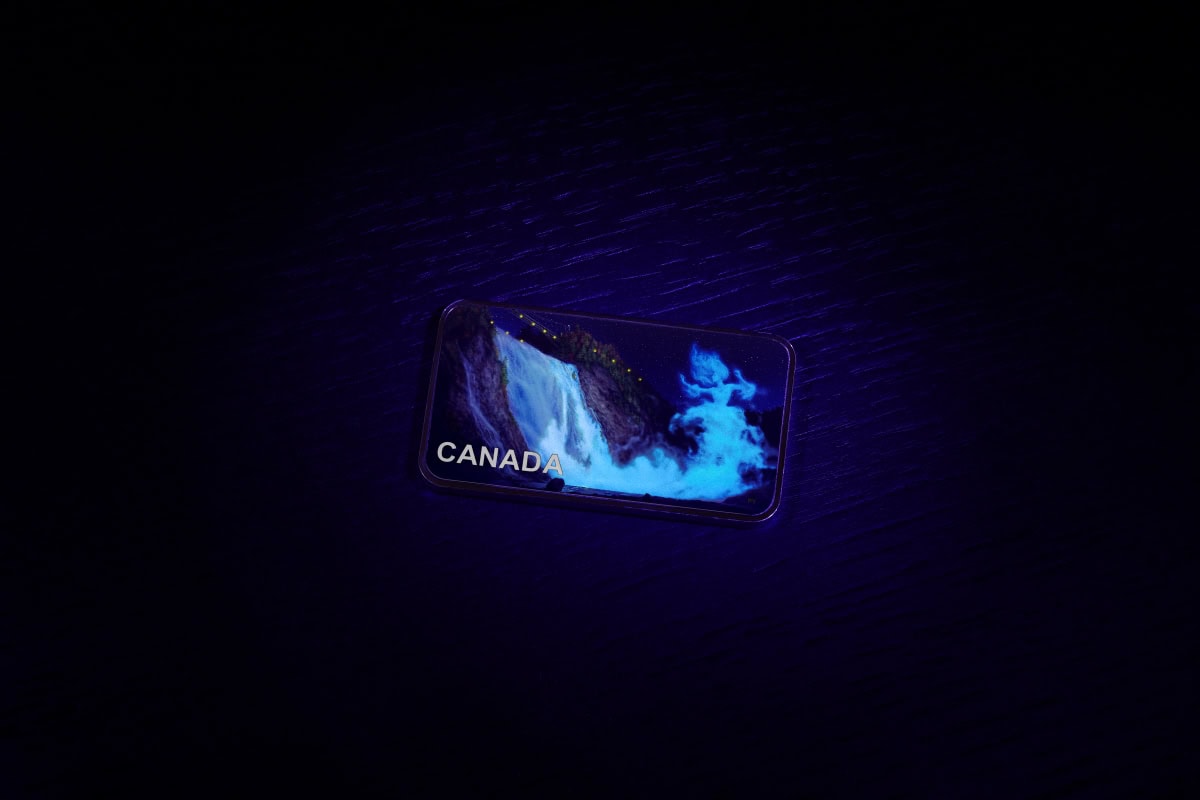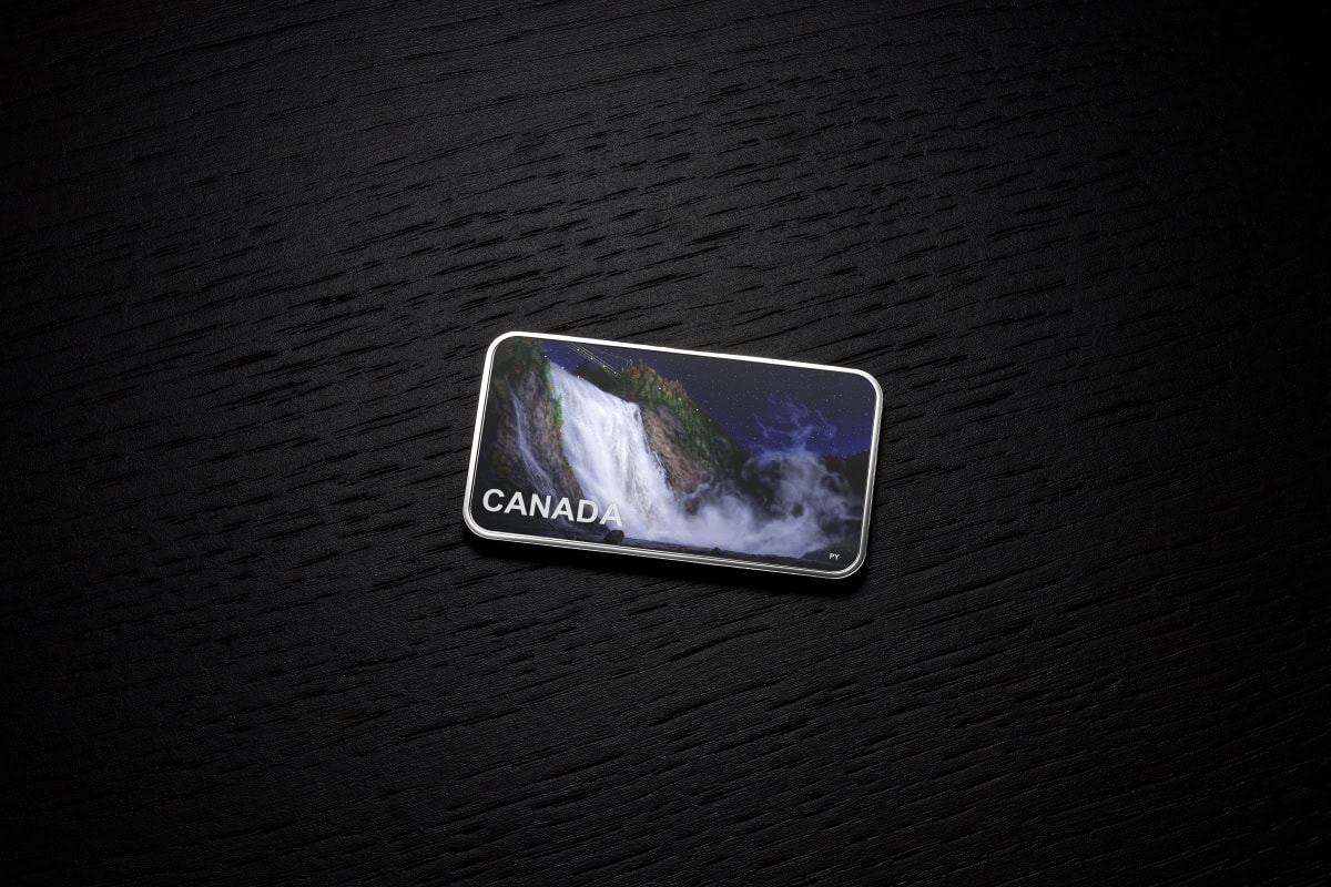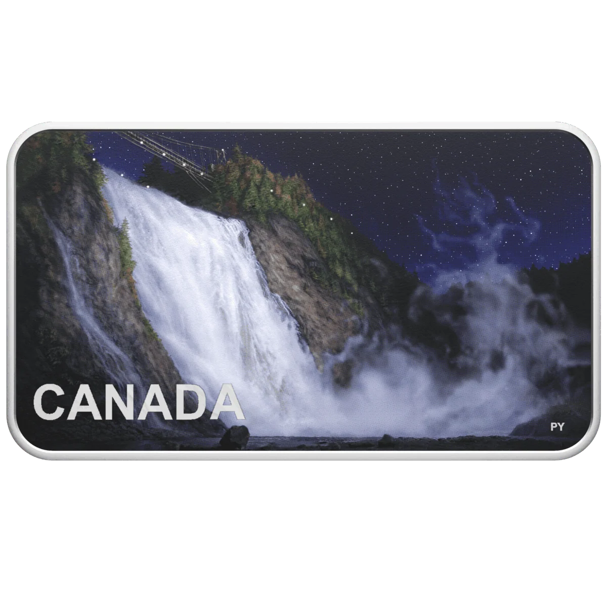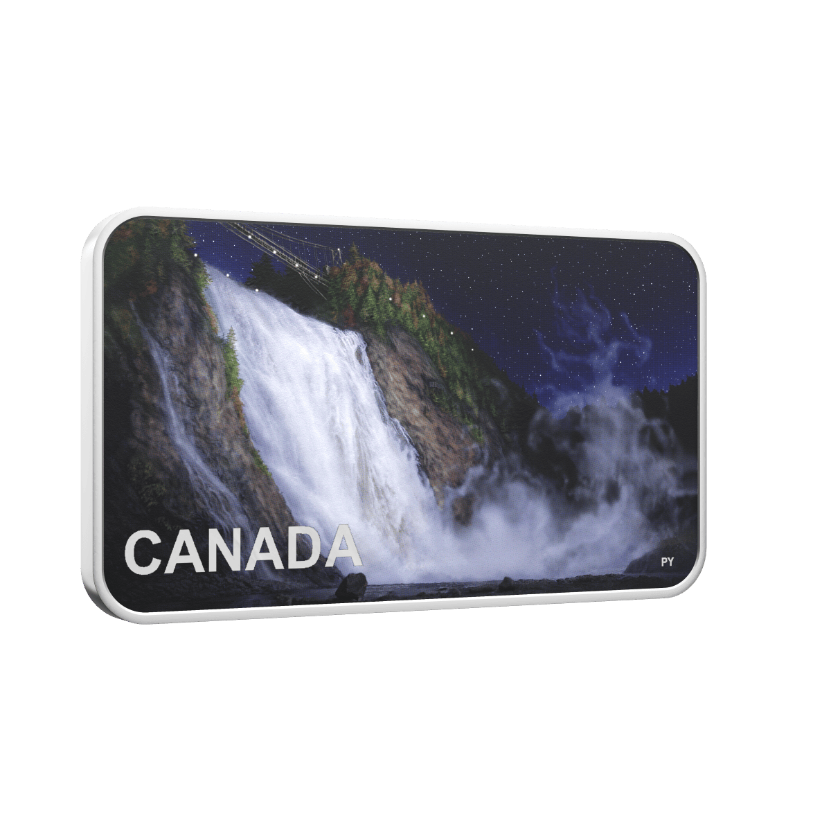 Crafted by the Royal Canadian Mint, this rectangular coin contains 1 oz (31.56 g) of 99.99% pure silver. It measures 49.8 mm by 28.6 mm, offering a wide, cinematic view of the misty falls. The proof finish highlights a colorful landscape, while advanced black light paint reveals the Lady in White’s ghostly figure when illuminated by the included flashlight. This interactive feature transforms the coin from a traditional collectible into a storytelling experience.