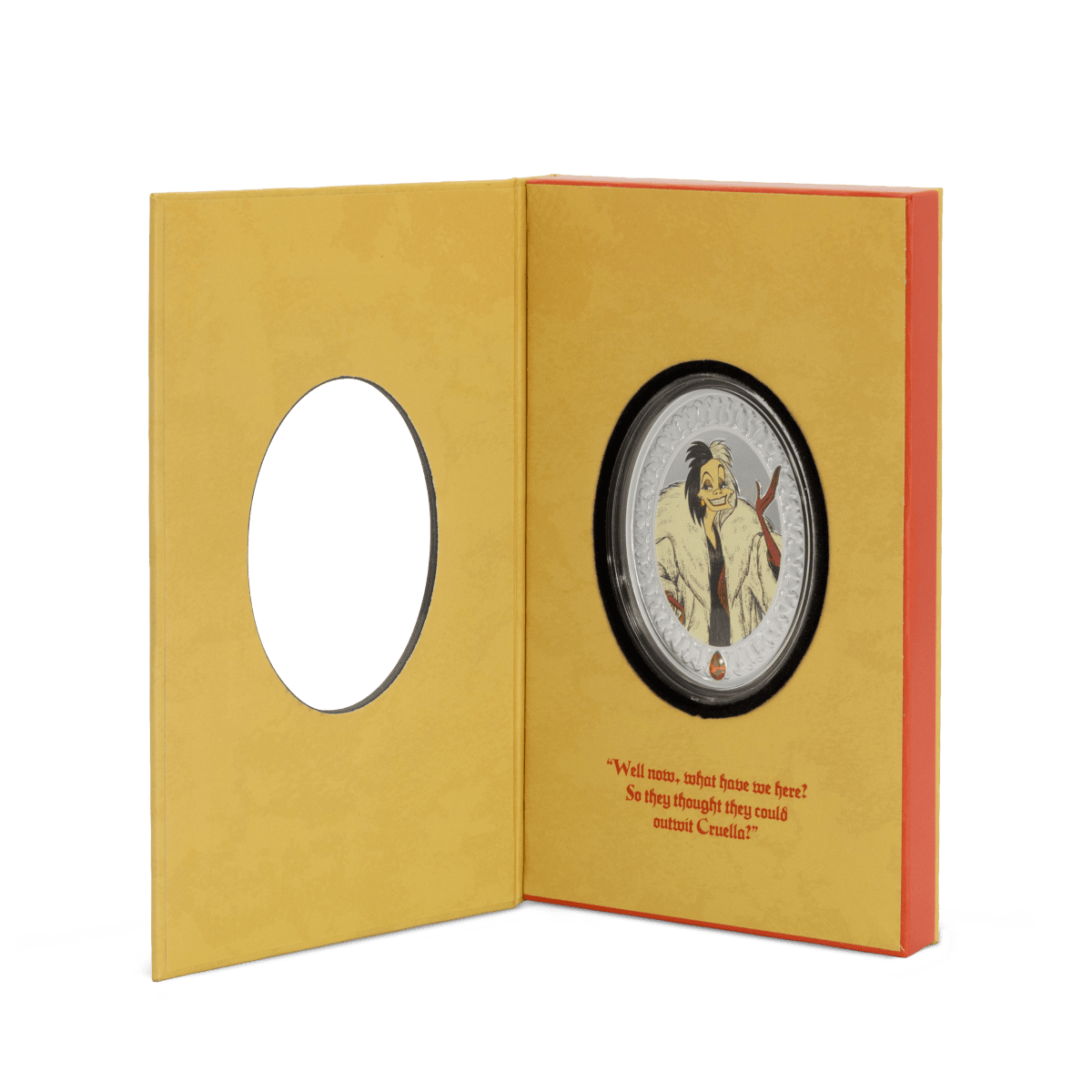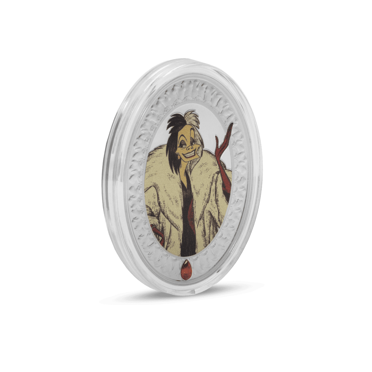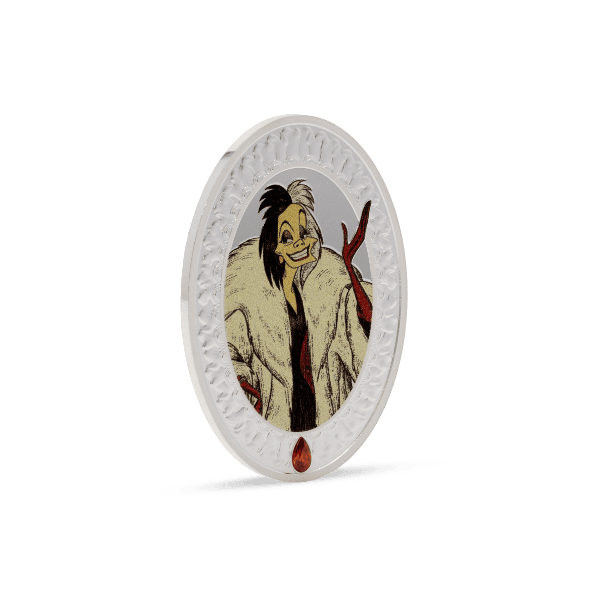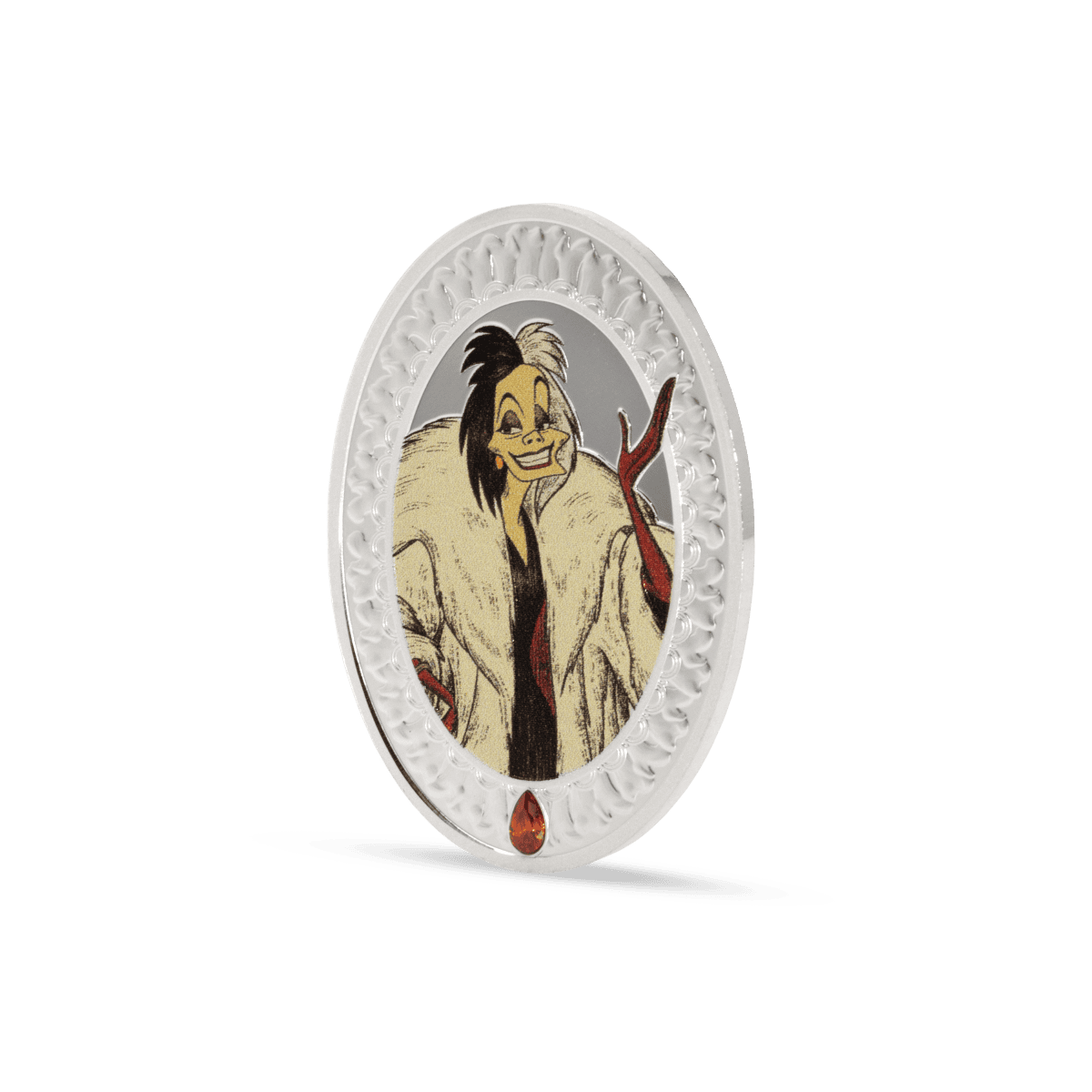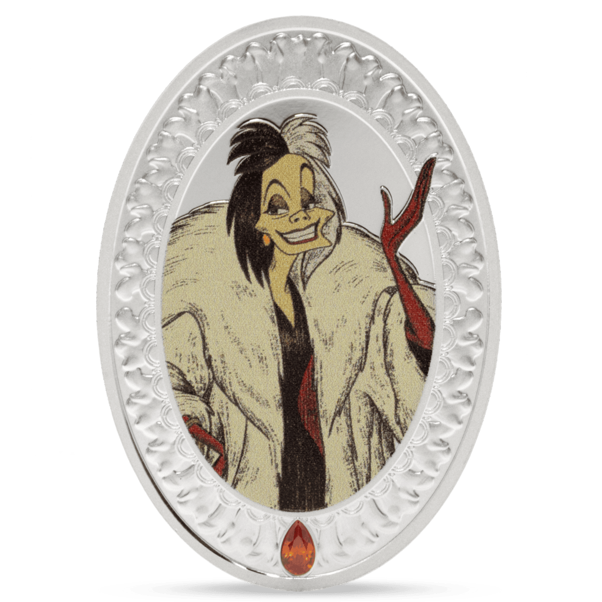 Crafted from 1 oz of .999 pure silver, this coin features a proof finish and vivid colorization. The design showcases Cruella in her signature look, framed in a unique wall art-style border that adds depth and drama. Additionally, a sparkling gemstone is set into the coin, enhancing its luxurious appeal.