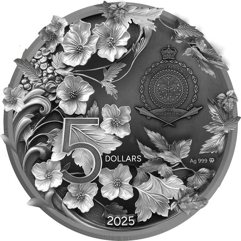 The obverse bears the official seal of Niue, confirming its status as legal tender with a face value of five dollars. In addition, inscriptions mark the coin’s purity and weight as 2 oz Ag 999. Produced by Mennica Polska (the Mint of Poland), it showcases advanced minting techniques and refined artistry.