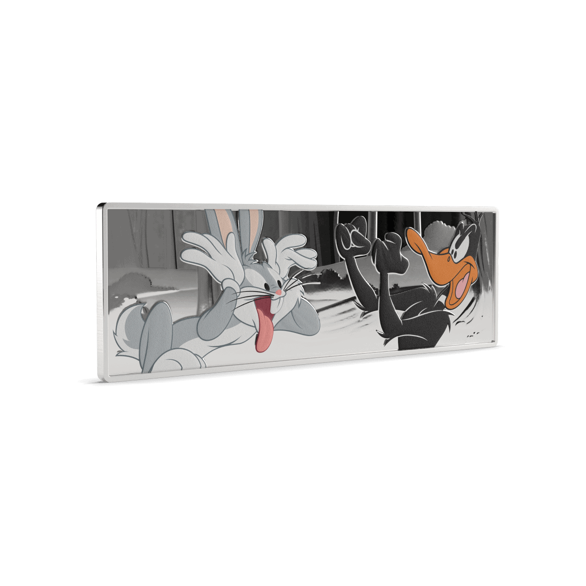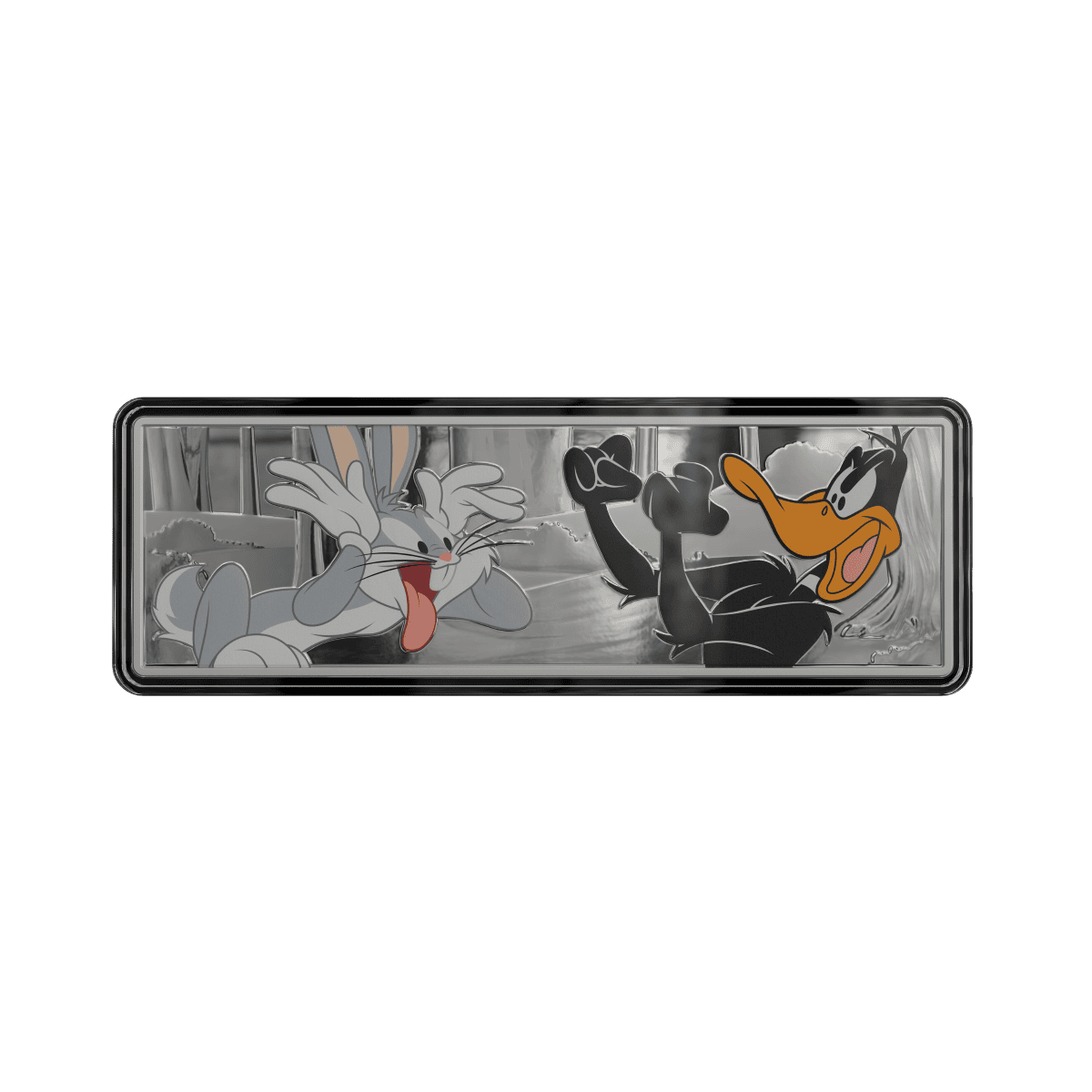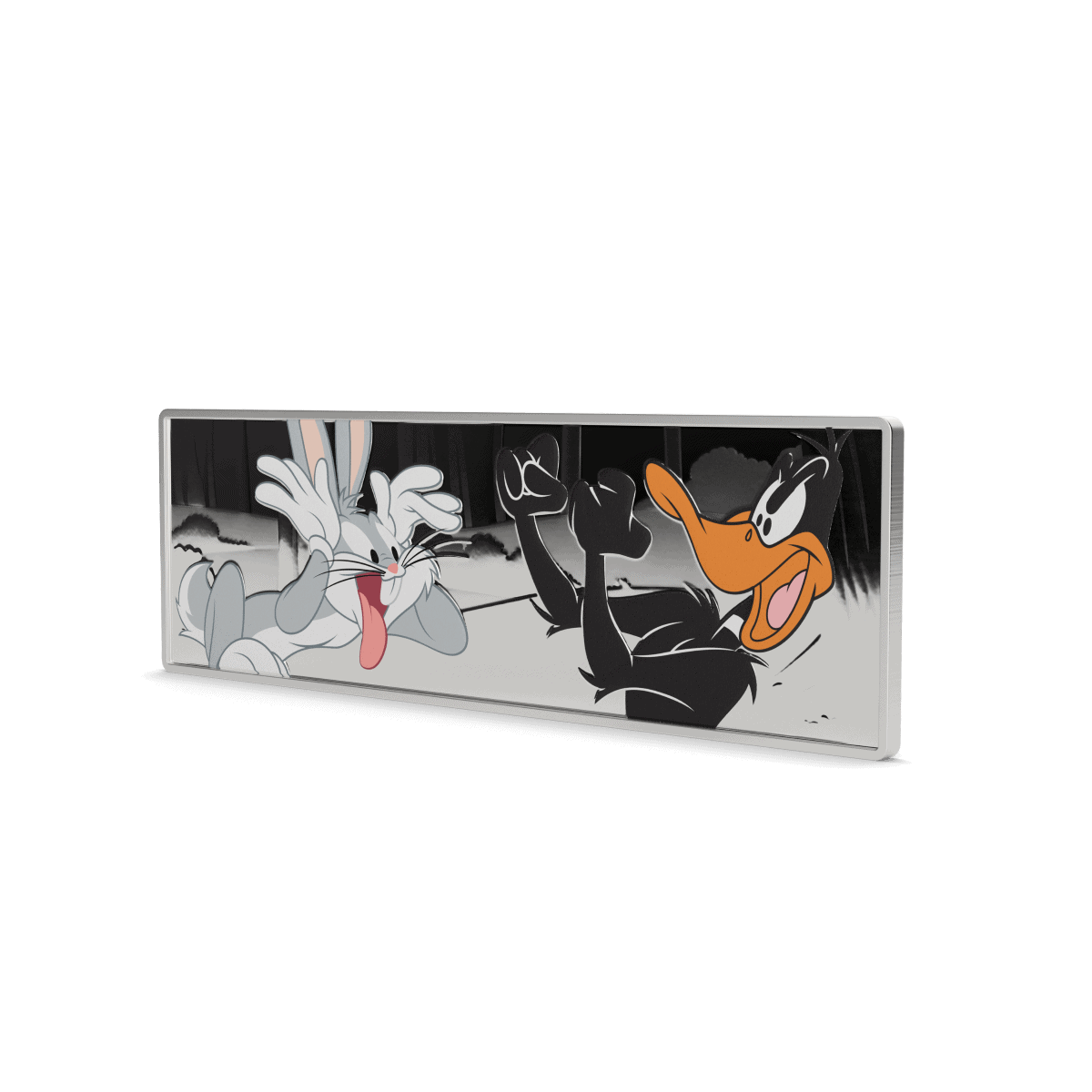 The proof finish highlights a lively front design. Bugs Bunny and Daffy Duck face off in full color, set against a mirror background with an engraved forest. Flip the coin and the comedy continues. Daffy chases Bugs through a whirlwind of posters, with a secret Easter egg hidden for collectors to spot.