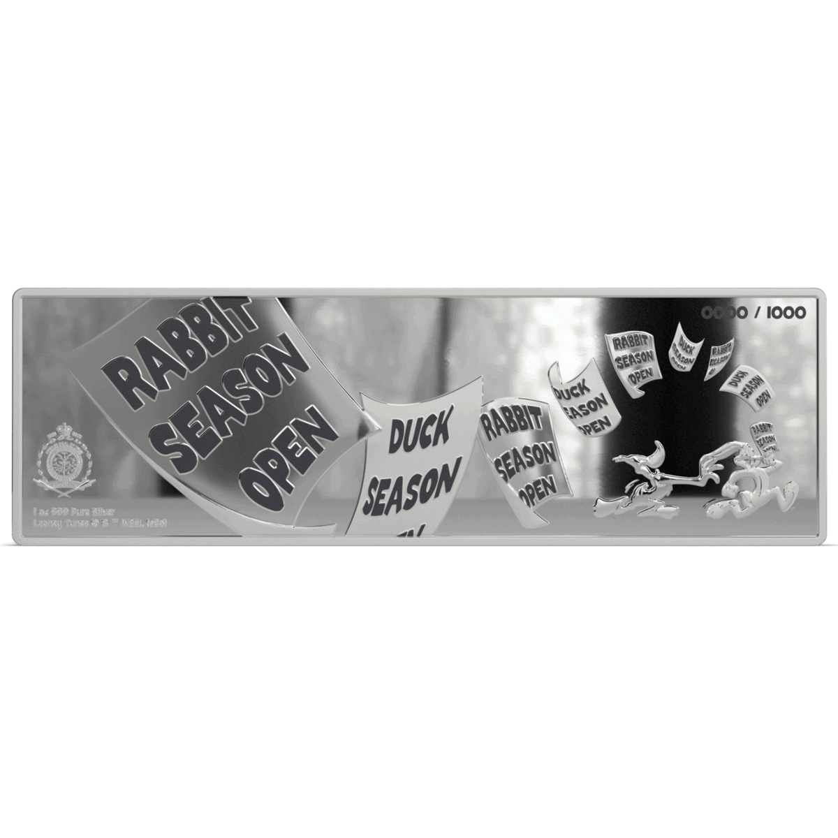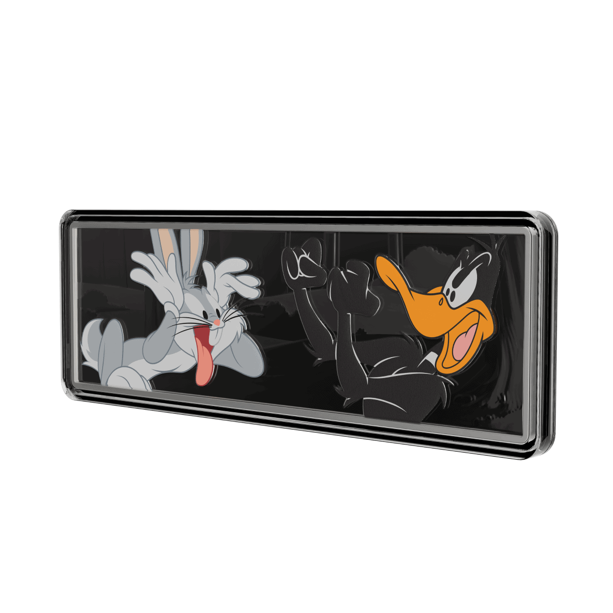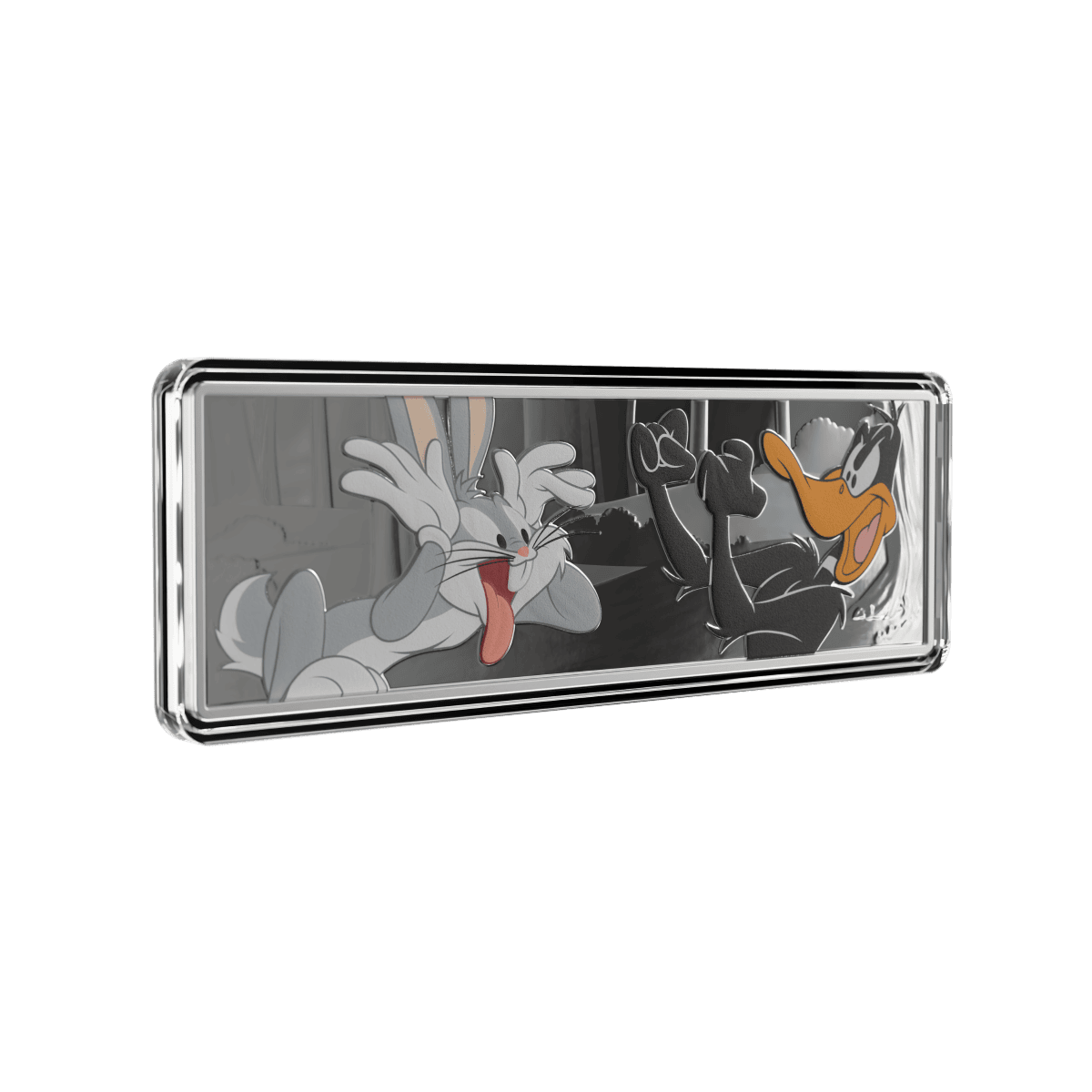 The proof finish highlights a lively front design. Bugs Bunny and Daffy Duck face off in full color, set against a mirror background with an engraved forest. Flip the coin and the comedy continues. Daffy chases Bugs through a whirlwind of posters, with a secret Easter egg hidden for collectors to spot.