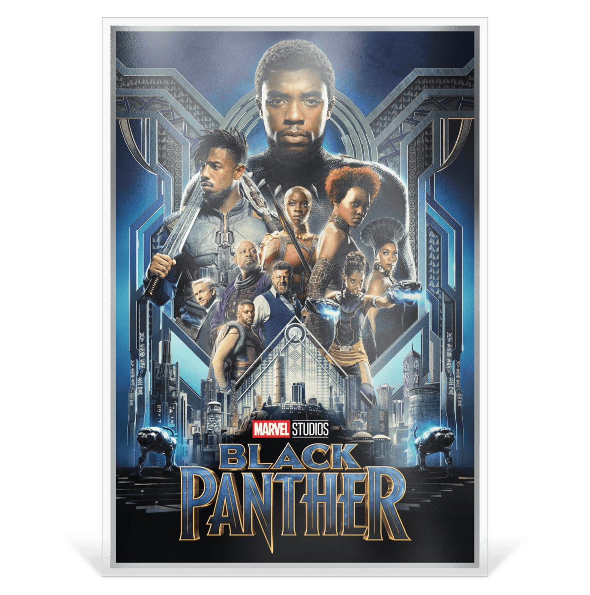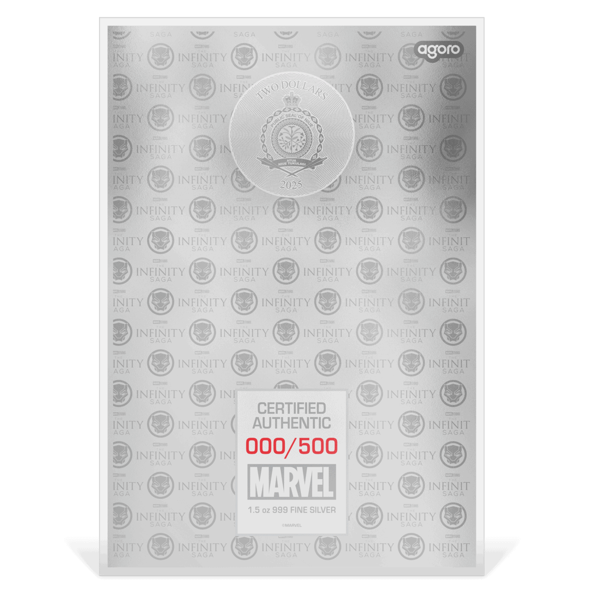 Crafted from 1.5 ounces of .999 pure silver, this foil carries a $2 denomination and the official Niue Coat of Arms effigy. Its generous format, 216mm x 320mm, creates an impressive display size that sets it apart. On the reverse, the Black Panther design stands boldly beside the Infinity Saga and Black Panther logos, confirming its authenticity and collectible appeal.
