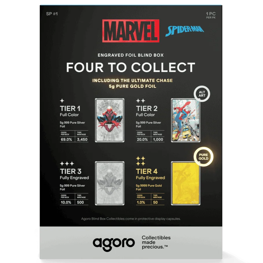 Each Blind Box contains one of four limited-edition Spider-Man foils, expertly crafted in either .999 fine silver or .9999 pure gold. You won’t know which version you’ve received until you open the box, making every purchase a true adventure.