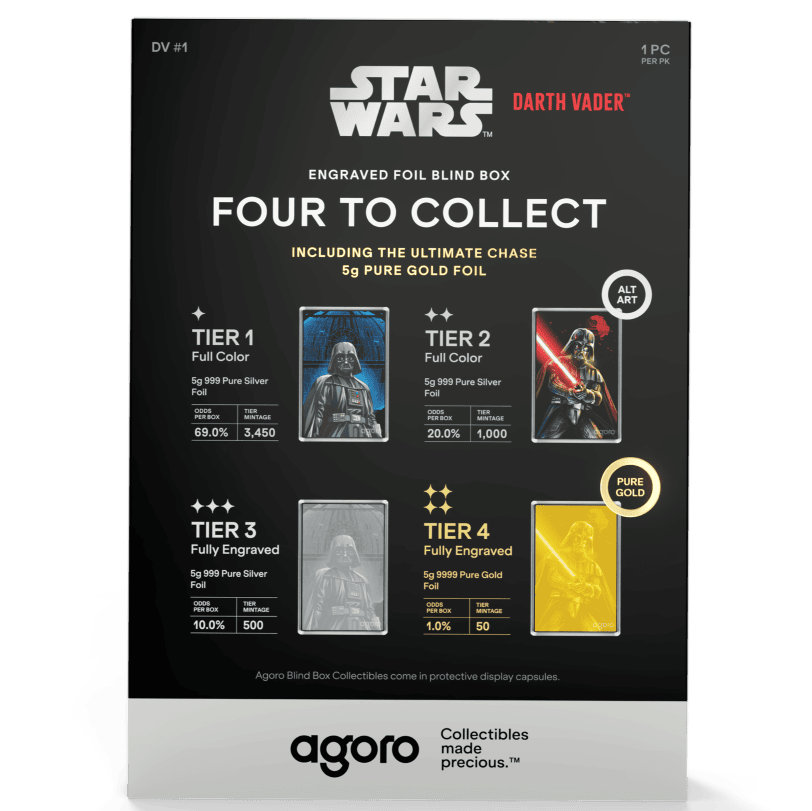 Each Blind Box contains one of four limited-edition Darth Vader foils, crafted in either .999 fine silver or .9999 pure gold. You won’t know which version you’ve received until you open the box—making every purchase a collectible adventure.
