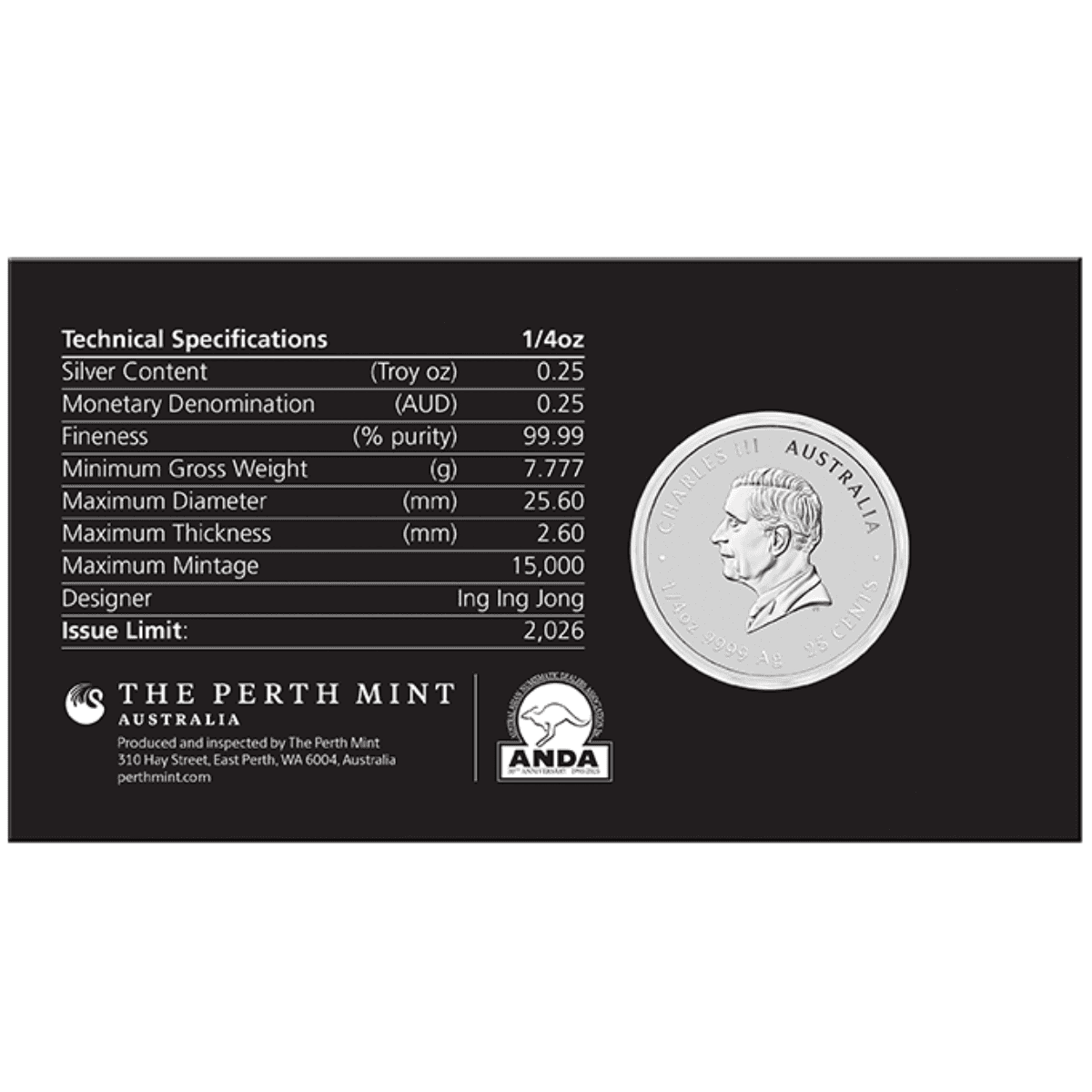 The coin’s reverse portrays a majestic mare alongside her young foal, both with elegant manes in a striking galloping stance. The background includes an image of mountainous landscapes and grassland. Included in the design is the Chinese character for ‘Horse’, the inscription ‘HORSE 2026’, and The Perth Mint’s ‘P’ mintmark. The obverse of the coin bears the Dan Thorne effigy of His Majesty King Charles III, along with details of its weight, fineness, and monetary denomination. This coin has a silver content of 0.25 troy ounces and a fineness of 99.99% purity. Its monetary denomination is $0.25 AUD. The minimum gross weight is 7.777 grams, with a maximum diameter of 25.60 mm and a maximum thickness of 2.50 mm. The maximum mintage is 15,000, with a special issue limit of 2,026. The coin comes in a card featuring the dates of the 2025 Hobart Money Expo.