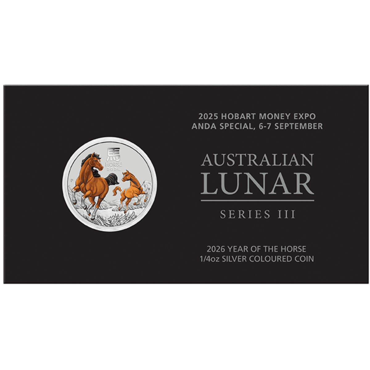 The Perth Mint is proud to present this exclusive 2026 Hobart Money Expo ANDA Special Year of the Horse 1/4oz Silver Coloured Coin from the Australian Lunar Coin Series III. According to Chinese tradition, the emperor ordered a great race to determine the 12 positions in the lunar calendar. The free-spirited horse galloped towards the finish line with determination. In a sudden twist, the horse was cheated by the snake, which was wrapped around its hoof, causing it to lurch back in fright. Despite this setback, the resilient horse claimed seventh place. People born under the sign of the Chinese Lunar Horse in 2026, 2014, 2002, 1990, and every 12th preceding year, are said to be independent, charismatic, and love adventure. Being passionate and spirited, they possess natural charm and an ability to inspire others.