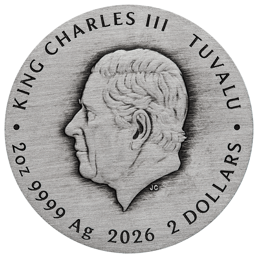 The obverse features Jody Clark’s effigy of His Majesty King Charles III, along with inscriptions for the coin’s weight, purity, denomination, and 2026 year-date. Measuring 40.69 mm in diameter and 5.86 mm thick, the piece offers a bold presence in hand.
