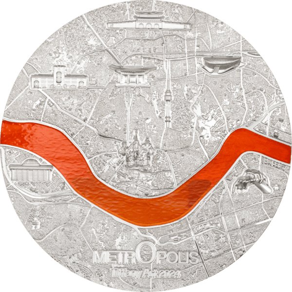 The 4th issue in the «Tiffany Art – Metropolis» series leads to the heart of the dynamic capital of South Korea – Seoul. The city map of this vibrant metropolis with over 9 million inhabitants is struck in exquisite detail on the reverse of the coin. As with previous issues in the award-winning series, select buildings are highlighted, including two representatives of the «Five Great Palaces». The Hangang River, represented by a bright orange Tiffany glass, runs along the entire front of the coin and under the detailed Bangwha Bridge on the back. The 3-ounce edition is limited to 999 pieces, while the 1-kilogram edition has a mintage of only 99 pieces.