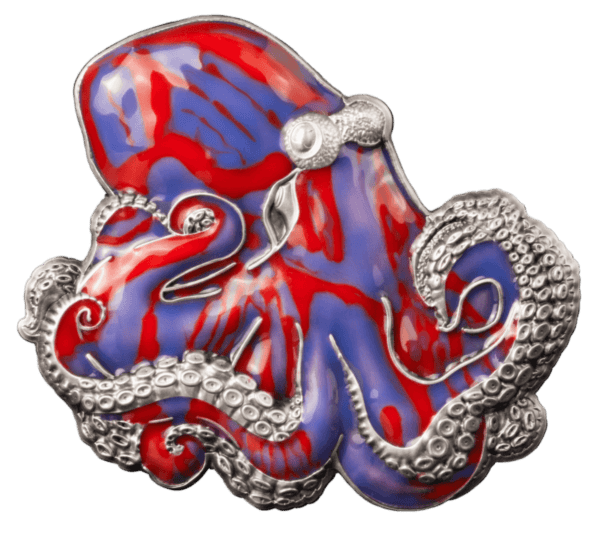 ▶ Through the innovative thermochromic effect on the reverse, the enamel changes its hues and brightness once it reaches body heat (above 30 – 36°C). The obverse shows the embossed octopus in full detail along with the coat of arms of Barbados in pure Silver.