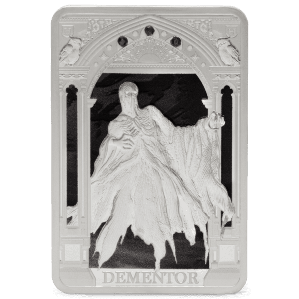 The proof-quality finish brings the wraithlike Dementor to life in frosted engraving, set against a haunting colorized background. Moreover, an elegant Hogwarts-inspired arch frames the design on both sides, while three black cubic zirconia stones add a dramatic, gothic touch. Additionally, the Dementor’s name shines below in a striking mirror finish, balancing artistry and dark allure.