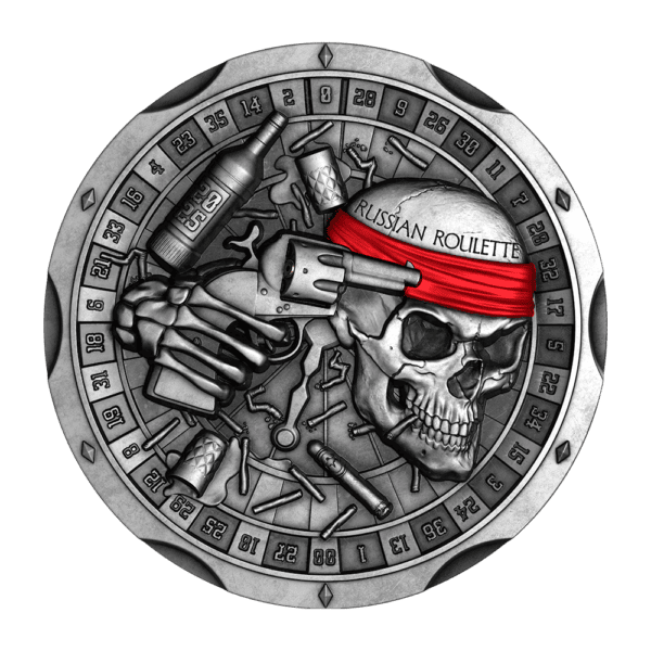 Take your shot, fortune favors the bold. This ultra-high relief coin captures the deadly gamble of Russian Roulette in stunning detail. Limited to 666 pcs only.